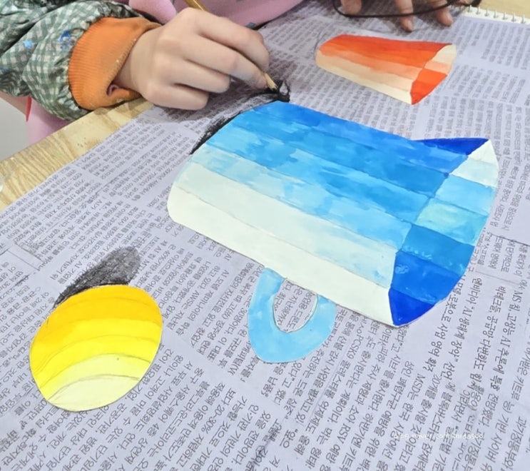 신문지 콜라주 위에 쌓아 올린 입체감 – 초등부 정물 입체 연습