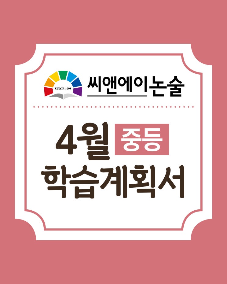 씨앤에이논술 <C&A논술> 중등 4월 학습계획서 안내 중등부 진도는 각 배움터 상황에 따라 상이할 수 있습니다. 각 배움터에 문의해 주시기 바랍니다. 씨앤에이논술 대치 본원 중등 학습계획서 ★ 중등부 진도는 각 배움터 상황에 따라 상이할 수 있습니다. 각 배움터에 문의해 주시기 바랍니다. ★ 중1 학습 계획서 이야기 속 세상 읽기 중1 커리큘럼은 ‘이야기 속 세상 읽기’입니다. 학생들은 국내와 해외에서 수상하여 가치를 검증받은 현대 문학 작품을 읽을 예정입니다. 삶의 방향을 정하고, 주변과의 관계를 조율하는 법을 깨달음으로써 주체적으로 자아를 형성해 나가는 소설 속 인물들과 함께 학생이 인간에 대한 이해의 폭을....... <img src="https://blogthumb.pstatic.net/MjAyNjAzMDlfMTU4/MDAxNzczMDQwOTAzNTE2.Two-IxfEF3vvPtUpAW4Tk4ZQElTPDNBYQNtZiw4YWYcg.wBX_3PfkJbi6pYM3YkmruJ2GjS6raqa2sNaiaP0YZScg.JPEG/%C3%CA%B5%EE_%BC%B1%C1%A4%B5%B5%BC%AD_a4%BB%E7%C0%CC%C1%EE.jpg?type=s3" />