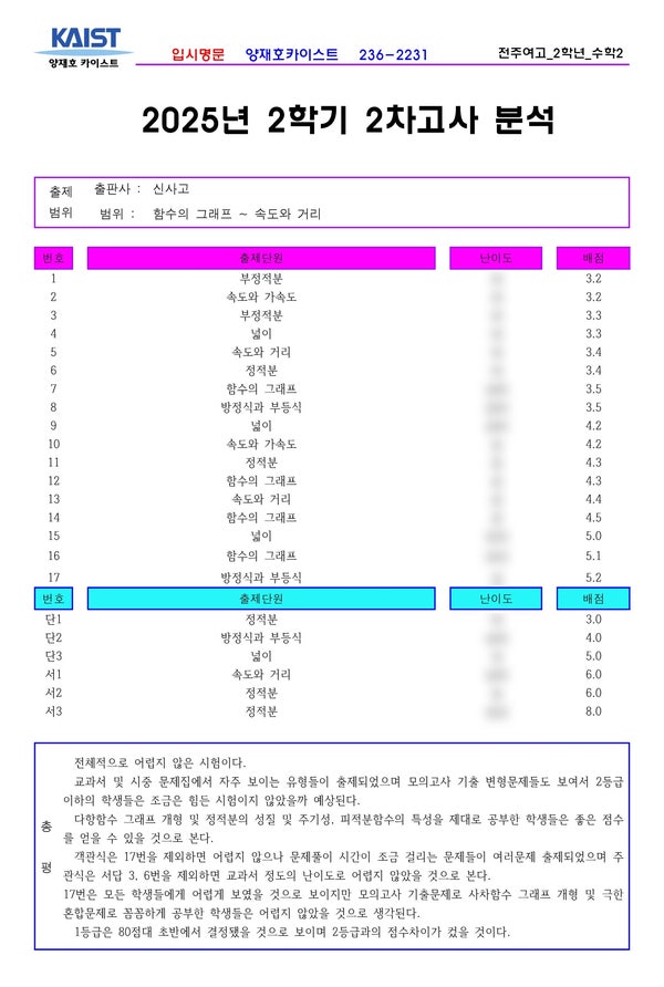전주여고 2학년 2학기 2차고사 수학2분석 전주 중★고등 입시수학의 표본인 전주 수학학원 양재호카이스트학원입니다. 이번에는 전주 전주여고 2학년의 수학2, 2025년 2학기 2차고사를 분석하여 보겠습니다. 위의 내용 중 난이도는 양재호카이스트학원의 내부자료입니다. 그런 이유로 블로그에서는 모두 공개할 수 없음을 양해바랍니다. 학원에 내원하시면 열람가능합니다. ^^ 중화산동 수학학원 양재호카이스트학원에서는 전주에 있는 중★고등학교의 기출을 항상 분석하고 기록으로 남기고 있습니다. 아직 시험을 보지 않은 학생들에게는 좋은 자료가 되고 또한 내년, 내후년에 후배들에게 많은 도움이 되기도 해서입니다. 그리고 시험직전에 시....... <img src="https://blogthumb.pstatic.net/MjAyNjAzMjJfMTg4/MDAxNzc0MTcwMTk5MzM5.pUjxF7E96VBaHsZMk2-96wHc_327otq_d_iSvOMK_Fkg.ONJZ_4CB_jG6SLnovqKzr4FRYLDQVGEGLoQaPZXZ63sg.JPEG/2025_%C0%FC%C1%D6%BF%A9%B0%ED2_%BC%F62%282%C7%D0%B1%E22%C2%F7%29.jpg?type=s3" />