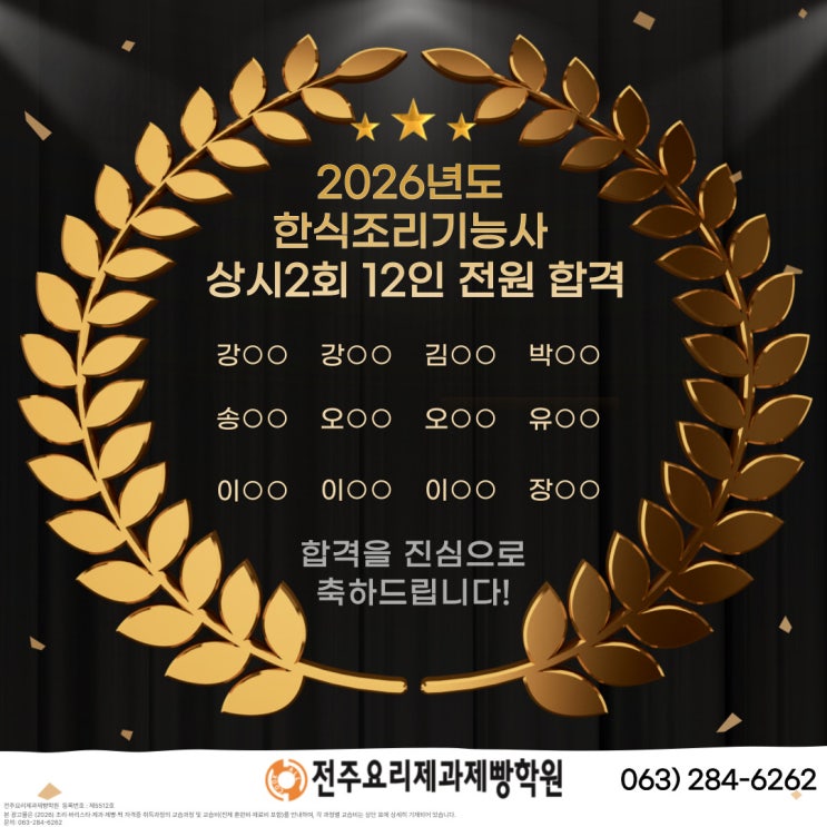 [전주요리학원]12명 응시 12명 합격, 한식조리기능사 합격 시스템의 차이