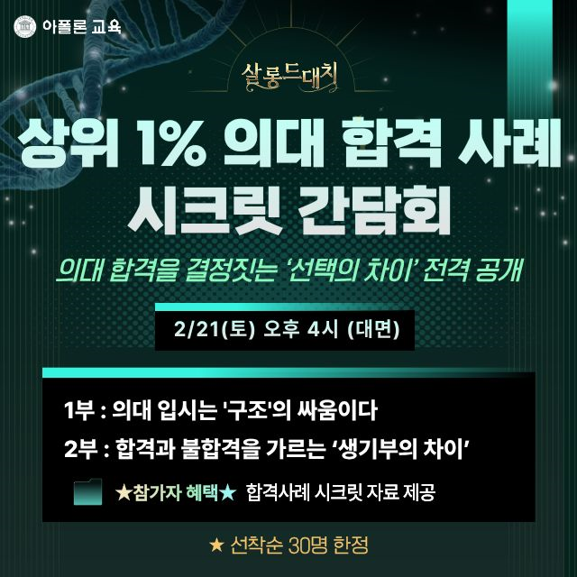 [살롱드대치-아폴론교육] ※ 선착순 30명 한정 ※ ▣상위 1% 의대 합격사례 시크릿 간담회▣ 의대 입시의 본질, 합격생 사례로만 확인할 수 있는 결정적 판단의 기준! 의대 합격을 가르는 ‘선택의 차이’ 현장 간담회에서 전격 공개합니다. ▼▼ 간담회 신청하기 ▼▼ https://forms.gle/KiLnboEXph44o7MS6 ▶일시: 2/21(토) 오후 4시 - 6시 (대면) ▶대상: 의대 합격을 목표로 하거나 26학년도 수시 메디컬 합격의 실제 차이가 궁금하신 예비고1~3 학부모님 ▶장소: 대치동 엘브라운 입시관 3층 (서울시 강남구 대치동 986-3 오송빌딩 3층) 아폴론교육 본원 도보 1분 ★★ 참가자 혜택 ★★ [ 메디컬 최신 합격사례 ] 시크릿 자료 제공 ※ 자료....... <img src="https://blogthumb.pstatic.net/MjAyNjAyMDNfMTkz/MDAxNzcwMDk1NjQ3NjQy.6C4QktoojcpDfTZ6aGqYgn6m4P75MJ7R6jFxBFU-YIUg._RLoHXPtkhunBNofpgmPZsTATU6Qilk7FEU1HpmakPkg.PNG/image.png?type=s3" />