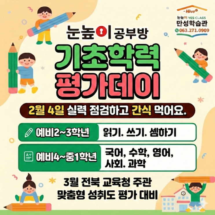안녕하세요! 눈높이 만성 공부방입니다. 길게만 느껴졌던 겨울 방학이 훌쩍 지나가고 새 학기를 맞이할 설렘이 가득한 2월이 시작되었네요~ 새 학기를 앞둔 학부모님이라면 "우리 아이가 지난 학년 내용은 잘 이해하고 있을까? ~ 3월에 학교에서 시험 본다는데 잘 볼 수 있을까? 하는 걱정이 되실 거 같아요. 특히 전북 지역 학부모님들이라면 3월 전북 교육청 주관 '맞춤형 학업성취도 평가' 소식이 있어 남은 겨울 방학을 어떻게 보내야 할지 고민이 많이 되실 거 같아요~ 그래서 저희 눈높이 만성 공부방에서는 새 학기의 걱정은 덜고 아이들의 실력을 점검해 새 학기의 자신감을 높일 수 있도록 "2월 4일 기초 학력 평가....... <img src="https://blogthumb.pstatic.net/MjAyNjAyMDRfMjAy/MDAxNzcwMTg3ODMwMzk3.mvYY3qX-VfTqaPQYSw6dx8weZr3ZqJ3cwrsoPmxK-eYg.lslskmTVAScUMoFwGsgDuiJ7xPHE4Bgtort3AfZmqK0g.PNG/900%A3%DF1770182977014.png?type=s3" />