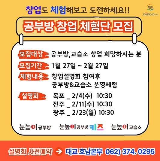 창업도 체험해보고 도전하세요! 공부방 창업을 생각중이신분 또는, 개인 공부방을 운영 해보신 분이라면 혼자서는 힘든 온라인 마케팅, 행사, 상담, 회원모집, 교육정보 교육 등을 함께 해주는 든든한 전문 팀이 있답니다. 프렌차이즈 공부방을 운영 중이시라면 개설때만 반짝 도와주는 지원이 아니라... 기획부터 교육, 홍보까지 모든 것을 밀착 케어 해드리는 전담 서포터들이 매월 함께 해드립니다. 브랜드 체인지를 통해 새로눙 지원을 받으면서 2배, 3배 성장하는 기쁨을 함께 해보세요. 경력단절 중이어서 어떻게 해야 할지 모르시겠다면 공부방 체험을 통해 프로세스를 익히고 개설 준비중에도 여러 곳을 벤치마킹하며 우수사례를 직접보....... <img src="https://blogthumb.pstatic.net/MjAyNjAyMDRfMjU5/MDAxNzcwMTkxNDc3OTY1.pSC_iwUoupxVWGM1Boei_Uu2mooY27fcvmx-xgZxnZYg.6u6kHGy1sbOzy_GmymgwkIjOdXZI7ZFfZHF8jXSzylMg.JPEG/5.jpg?type=s3" />