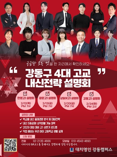 우리 아이 고교 진학, 막막하셨죠? 강동구 주요 4대 고교(한영/광문/상일여/강동)의 내신 경향부터 2029 대입 로드맵까지 완벽히 분석해 드립니다! "중학교 때 잘했으니 고등학교도 잘하겠지?" 급변하는 입시 제도와 5등급제 개편, 학교별 맞춤 전략 없이는 위험합니다. 4대 고교 전문가들이 모여 '진짜 정보'를 공유합니다. 내신 분석은 물론, 아이와 함께 직접 설계해보는 고교 생활 로드맵까지 확인하세요! ️ 고교별 설명회 일정 한영고1: 2/12(목) PM 7시 광문고1: 2/13(금) PM 7시 상일여고1: 2/20(금) PM 7시 강동고1: 2/24(화) PM 2시 ✏️ 설명회 내용 * 학교별 내신 출제 경향 및 대....... <img src="https://blogthumb.pstatic.net/MjAyNjAyMDRfMjYx/MDAxNzcwMTg4Njc2MjYz.rTckPsuDgUsR_L34VxaBTHe6xeZ1dxIRwmyqmwol-Ygg.TVpvX1R1mP_AqyIVyHi0dS-sCTzGu-Bmxs34LPEoqiUg.JPEG/%B0%AD%B5%BF%B1%B8%B3%BB2%C2%F7%BC%B3%B8%ED%C8%B8.jpg?type=s3" />
