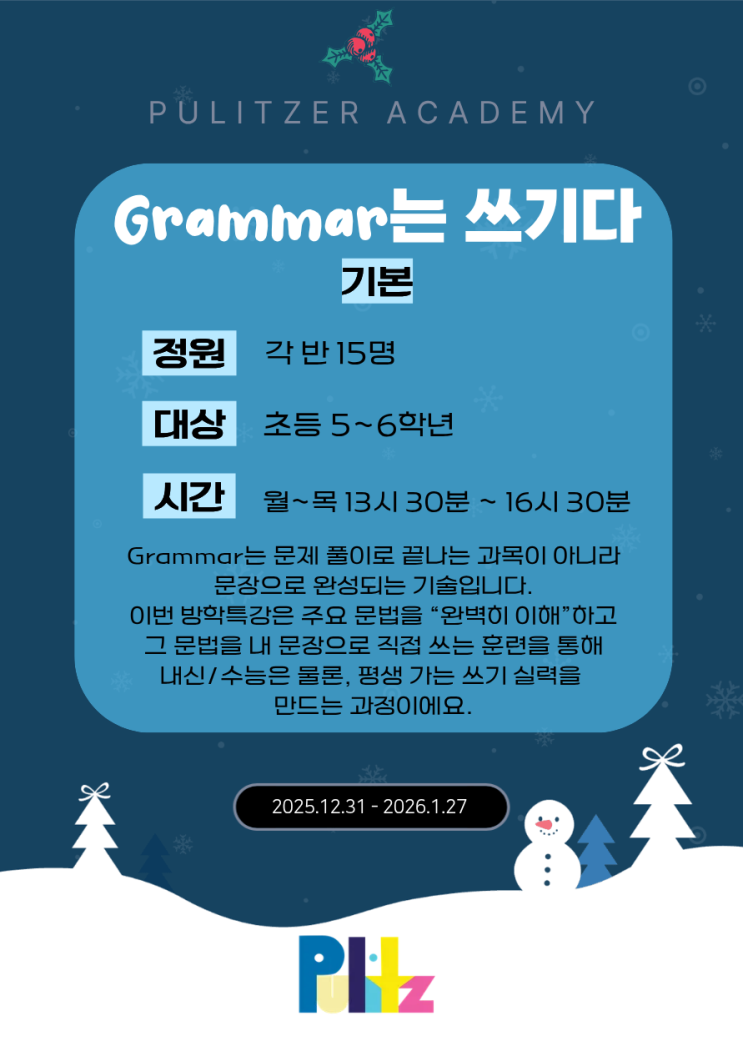 안녕하세요, 퓰리처영어학원입니다. 오늘은 퓰리처의 대표적인 문법 강좌, 'Grammer는 쓰기다'를 소개합니다. 이쯤에서 드는 궁금증. Grammer는 왜 쓰기인걸까요? 지금부터 같이 알아보시죠! 문법 고수 되기, 퓰리처영어학원과 함께라면 어렵지 않습니다. 평생 문법 기초, 이제 퓰리처와 함께 잡으세요! <img src="https://blogthumb.pstatic.net/MjAyNTEyMjFfMjY2/MDAxNzY2MzI3MzM1NzU3.8YAYtcf80pO31NajCveyxyBxKwJh6-gxiFRDFf6vhpgg.4UjUOrJ22j7KljRpWxbYr79zgWp-lCdTaPmLQIsl6qQg.PNG/1.png?type=s3" />