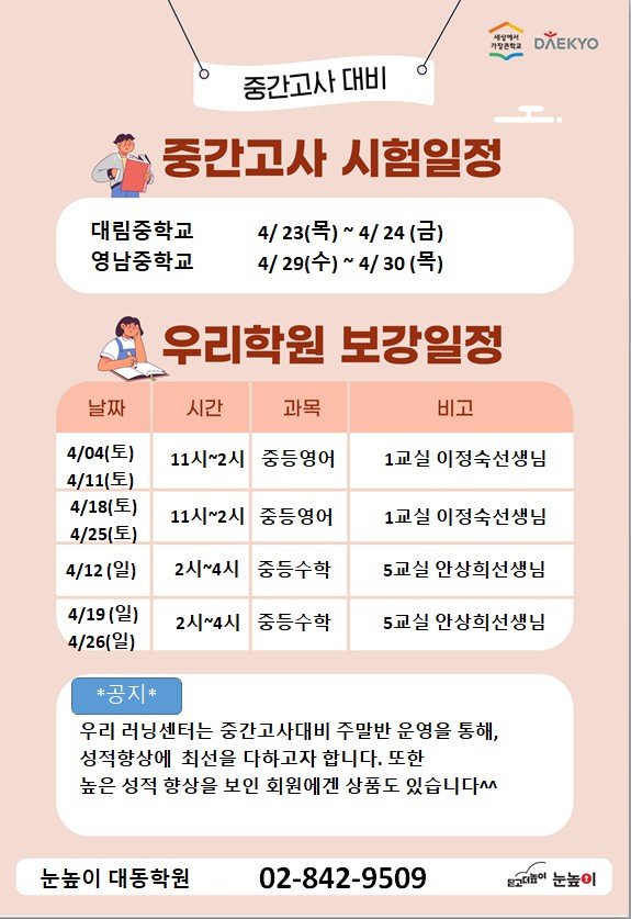 대림동 대림중,영남중 26년도 첫 중간고사 일정이 나왔습니다. 저희 눈높이 대동학원에선 국,영,수 전문 선생님의 1:1 맟춤관리로 성적 향상에 최선을 다하고 있습니다. 체험수업도 진행하고 있습니다. 꼭 한번 들르셔서 상담 받아보세요^^ <img src="https://blogthumb.pstatic.net/MjAyNjAzMjRfNjUg/MDAxNzc0MzQyNzI4Mjg3.vdDsqIsHLaLZtIBLjxxj01kAj8yOMW3V9foBnYTBfgEg.BJD-LYMKJ3XeVyr2UfWp3IbpiQyZ2RetjS-bKQuOjfkg.JPEG/%C1%DF%B0%A3%B0%ED%BB%E71.jpg?type=s3" />
