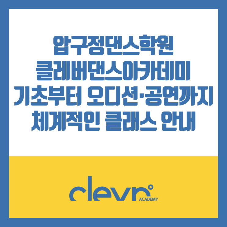 압구정댄스학원 클레버댄스아카데미|기초부터 오디션·공연까지 체계적인 클래스 안내 압구정댄스학원을 찾는 이유는 단순히 춤을 배우기 위해서만은 아닙니다. 기초를 제대로 다지고 싶어서, 오디션을 준비하기 위해서, 무대 경험을 쌓고 싶어서, 혹은 아이돌이라는 꿈에 한 걸음 더 다가가기 위해서입니다. 압구정댄스학원 클레버댄스아카데미는 입문부터 전문반까지 단계별 시스템으로 운영되는 트레이닝 아카데미입니다. 압구정댄스학원 입문반 (베이직 CLASS, 90분) 모든 수강생이 거쳐가는 기본 과정입니다. 아이솔레이션 기초 훈련 리듬 이해 및 음악 해석 몸의 중심과 기본 스텝 트레이닝 압구정댄스학원에서 가장 중요한 것은 안무 속도....... <img src="https://blogthumb.pstatic.net/MjAyNjAyMjJfMjYz/MDAxNzcxNzI3MzUwNjM2.foB01Zo-brakQmwvHTlxdz5kMaju7v6X_1o8QoMmhCUg.D_dQ2OlElZXyEDYXBjL3JQDqbalvCGNLvmhzS_NlrvAg.PNG/010.png?type=s3" />