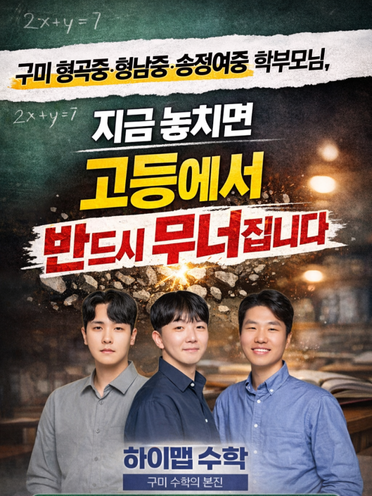 설 연휴 이후, 학부모님들께 드리는 말씀 안녕하세요. 구미 수학의 본진, 하이맵수학입니다. 설 연휴는 잘 보내셨는지요. 가족과 함께하는 따뜻한 시간 속에서 아이들도 잠시 숨을 고르는 시간을 가졌으리라 생각합니다. 연휴가 지나고 나면 다시 일상과 학습의 흐름을 회복해야 하는 시기입니다. 그리고 이 시점은 생각보다 중요합니다. 구미 중등부, 지금이 방향을 잡을 때입니다. 형곡중, 형남중, 송정여중, 구미여중, 광평중… 학교마다 시험 스타일과 분위기는 조금씩 다릅니다. 어떤 학교는 서술형 비중이 높고, 어떤 학교는 계산 정확도를 더 요구합니다. 어떤 학교는 응용 문제가 많아 사고력을 요구하기도 합니다. 하지만 분명한 공통점....... <img src="https://blogthumb.pstatic.net/MjAyNjAyMThfMjc3/MDAxNzcxMzgxNjUyMjkz.Zoba2kmB36yvsEouC3UvMbaYocNj_IlyPESByZ6NRN8g.wHNBsHKMzVMwjJcUgyspI-gkN6C-ho4wNL8NTqt14G4g.PNG/900%A3%DFfile%A3%DF00000000145071fab63dd12d484bc907.png?type=s3" />