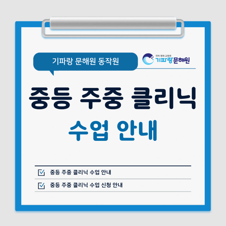 안녕하세요 :) 문해력에 파도를 일으키는 기파랑문해원 동작원입니다. 오늘은 중등 재원생 대상으로 실시할 '클리닉 수업'에 대해 안내해드리겠습니다. 클리닉 수업은 문법 · 독서 · 문학 영역 중 학생별 취약 영역을 중심으로 구성되며, 시청각 자료를 활용한 수업으로 진행될 예정입니다. 수업 시간 동안 학생들은 필기를 진행하며 수업에 참여하게 되고, 수업 종료 후에는 필기 상태를 점검하여 학습 내용이 잘 정리되었는지도 함께 확인할 예정입니다. (주중 클리닉 수업은 글쓰기 클리닉과 다른 수업 입니다. 유의 부탁드립니다.) [중등 클리닉 수업 안내] 대상: 중등 재원생 수업료: 무료 정원 10명으로 선착순 마감됩니다 :....... <img src="https://blogthumb.pstatic.net/MjAyNjAzMTJfMjM4/MDAxNzczMjk2MDY5NzQx.x1tUDo3BoQbVs2TmwhPhKjpqSCPoUYOZyOaYpjX6wlMg.9or5NoWN1vlyeu9kV6b_TyWMywNuN6mZXdubv4O1Wygg.PNG/1.png?type=s3" />