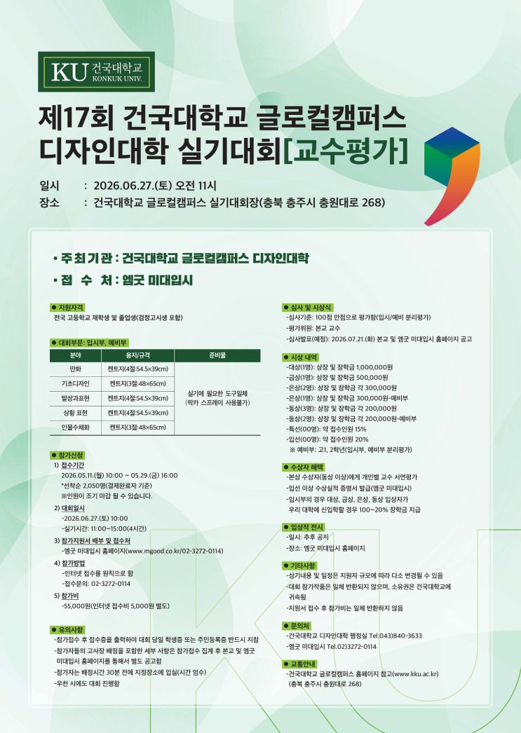 2026 전국 디자인 실기대회 제 17회 건국대학교 글로컬캠퍼스 디자인대학 실기대회[교수평가] 안녕하세요. 동작구 노량진역 "노량진 크림 미술학원"입니다. 제 17회 건국대학교 글로컬캠퍼스 디자인대학 실기대회[교수평가] 주관기관 건국대학교 글로컬캠퍼스 디자인대학 (충북 충주시 충원대로 268) 지원자격 전국 고등학교 재학생 및 졸업생(검정고시생 포함) 대회부문:입시부,예비부 접수기간 2026.05.11(월) 10:00~05.29(금) 16:00 *선착순 2,050명(결제완료자 기준) ※인원이 조기 마감될 수 있습니다. 대회일시 2026.06.27(토)10:00 실기시간: 11:00~15:00(4시간) 접수처 엠굿 미대입시 홈페이지 참가방법 인터넷 접수를 원칙으....... <img src="https://blogthumb.pstatic.net/MjAyNjA0MjJfMTUw/MDAxNzc2ODM4NzA3MjM4.nuxfKAWlqNM2w9XFS7e0S5DLD2P1qVw7DA1y-ANxOWAg.hjyDaxReoyUdKrKBnhoVT0Ys0erfjK6UfZv5PiK3YNQg.JPEG/KakaoTalk_20260422_123204762.jpg?type=s3" />
