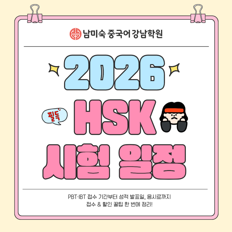안녕하세요! 남미숙 중국어 강남학원 입니다 여러분~ 취업 시즌을 앞두고 자격증 고민 많으시죠? 오늘은 취업에 도움되는 중국어 자격증 HSK 시험 일정을 알려 드릴게요~~ PBT·IBT 차이부터 접수·할인 꿀팁, 응시료, 성적 발표일까지 한 번에 싹! 정리해드릴게요 PBT vs IBT 당신의 선택은? HSK PBT 시험은 지정 고사장에서 시험지와 OMR카드를 직접 작성하는 방식입니다 ✔️장점 시험지를 직접 보며 밑줄을 긋거나 표시할 수 있어 지문 가독성이 좋고 핵심 정보 파악이 수월해요 ✔️단점 쓰기 영역에서 한자를 직접 써야 해요 특히 6급의 경우 지문을 읽고 약 400자로 요약 작성해야 하므로 평소 한자 실력이 부족하다면 부담이 될 수 있....... <img src="https://blogthumb.pstatic.net/MjAyNjAyMjZfMiAg/MDAxNzcyMDk3OTYyOTkx.drfrCjRud1RaxajwB-q0ueFE40fvQdh4pf79sLIReZAg.sQaLXN-A4sHHtHGFN1D3PB60JxJmcgWmhSxlh5BPotMg.PNG/%C1%A6%B8%F1%C0%BB_%C0%D4%B7%C2%C7%D8%C1%D6%BC%BC%BF%E4..png?type=s3" />