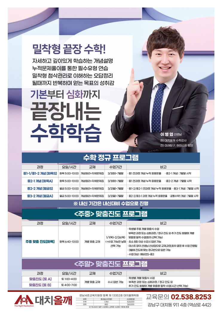[대치올깨학원] 중1 학생을 위한 “중1과정” 시작반~! 늦었지만 대치올깨에서 만든 “100곰 수학” 프로그램을 통해 꼼꼼하고 철저히 계획된 커리큘럼으로 준비한다면, 수학의 자신감과 원하는 수학의 성취도를 갖을 수 있을 겁니다. ▶ 이병엽T [중등수학 1-1/1-2 시작반] 3월3일(화) 개강 : 수업 예약: https://vo.la/jfzgnf : 화목 5시~10시 주2회 5시간, 3월~7월까지 5개월 동안 중1과정 기본 완성 : 연계과정 8월부터 [중2-1 개념 시작반] - 개념과 응용심화를 동시 학습 진행 (중2-1 개념원리 + 중1-1 & 중1-2 과정 응용심화 문풀) - 중1-2학기 내신대비 (중학교 첫 시험, 철저한 내신대비 준비 과정을 통해 계속적으로 반복되는 내신....... <img src="https://blogthumb.pstatic.net/MjAyNjAyMjFfMjY1/MDAxNzcxNjQxNjkzMTI1.c-nPGetynM_MURTzfHSTRrTkFQ2c3sjg3iVsV64D0mkg.hSTkfE0J6GuPRWY19kUeleapP79pMzXv5RHRqYYnuQYg.PNG/KakaoTalk_20260122_213850596_01.png?type=s3" />