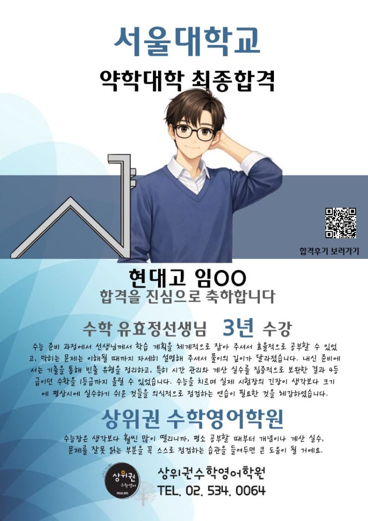 반포 수학학원 상위권 수학 3년 수강, 서울대 약학대학 합격후기