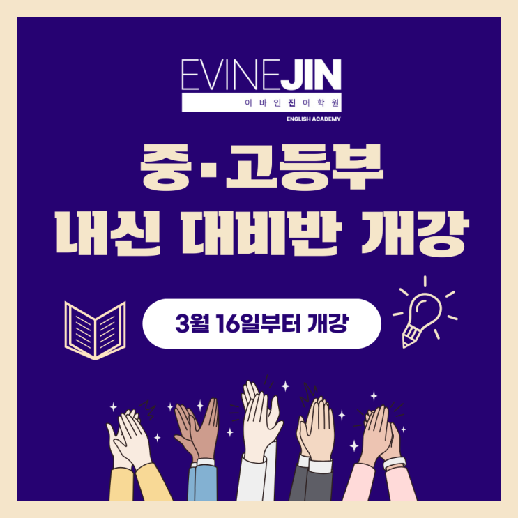 꼼꼼한 관리와 피드백, '리미티드클래스' 관리로 입소문난 방이동 영어학원 이바인진어학원 안녕하세요. 이바인진어학원입니다. 오늘은 새학기 시작과 동시에 다가오는 중간고사를 대비하는 중고등부 내신대비반 개강 소식을 안내드립니다. 학기 중 첫 시험인 중간고사는 학생들의 학습 흐름을 확인할 수 있는 중요한 시험입니다. 시험 직전에 급하게 준비하기보다는 학교 진도에 맞춰 차근차근 준비하는 것이 훨씬 안정적인 결과로 이어집니다. 저희 이바인진어학원에서는 3월 16일부터 학교별 중간고사 내신대비반을 개강합니다. 영어 내신을 준비하는 학생들이 보다 체계적으로 시험을 준비할 수 있도록 학교별 상황을 고려하....... <img src="https://blogthumb.pstatic.net/MjAyNjAzMTJfNDEg/MDAxNzczMjgzODk5NTY1.6720TcHjwlKjVebPPWqLcSvqzpq7lHQshyOgxRcZIvkg.Twe1IgorGsEWM2766yv8CKkvE3LFVtNm8_8Gr0MwyOwg.PNG/1.png?type=s3" />