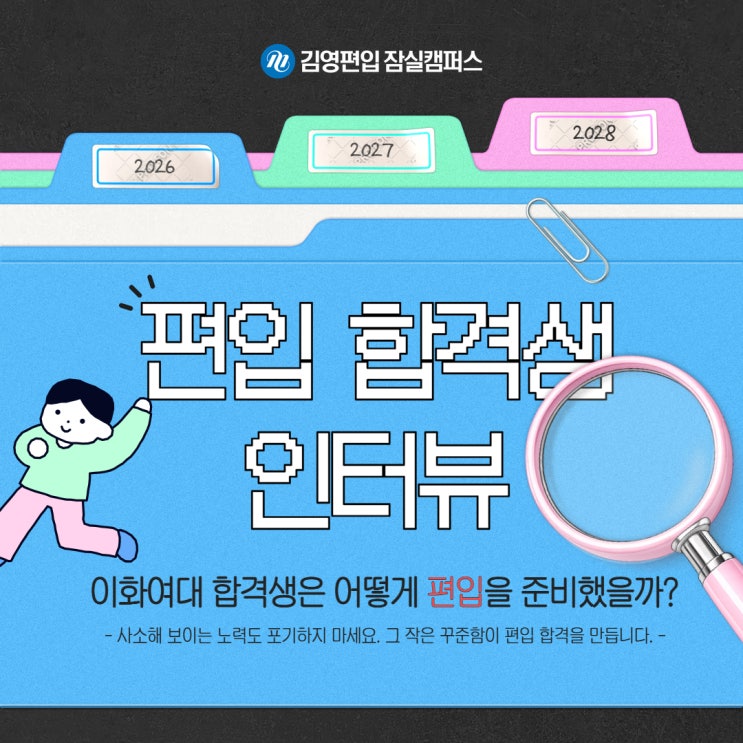 안녕하세요 잠실 강동 별내 위례 광진 천호 강남 송파 중랑 서초 구리 남양주 하남 김영편입 잠실캠퍼스 입니다. Q. 자기소개를 부탁드립니다. 안녕하세요. 이화여자대학교 인공지능학과에 합격한 학생입니다. 김영편입 잠실 캠퍼스에서 10개월 동안 공부했습니다. Q. 편입 합격 소감은 어떠신가요? 합격하게 되어 너무너무 기쁩니다. Q. 편입을 선택하게 된 이유는 무엇인가요? 전적대에 대한 학벌 콤플렉스를 극복하기 위해 편입을 선택했습니다. Q. 잠실 캠퍼스를 선택한 이유와 좋았던 점은? 체력 관리를 위해 집에서 가까운 학원을 선택했는데, 탁월한 선택이었습니다. 교수님들의 수업, 학원의 시스템 및 체계적인 관리가 모두 만족스러웠....... <img src="https://blogthumb.pstatic.net/MjAyNjAzMTZfNDAg/MDAxNzczNjIwMzU0MjEy.qCArxXAe0Jd-pDgpuyCLILFWyPQLFO01lAf297utxjog.4g06jLCRklGWdLqEHQG49KCnberOnaCRP4pOni77OC0g.JPEG/%C1%A6%B8%F1%C0%BB_%C0%D4%B7%C2%C7%CF%BC%BC%BF%E4_%289%29.jpg?type=s3" />