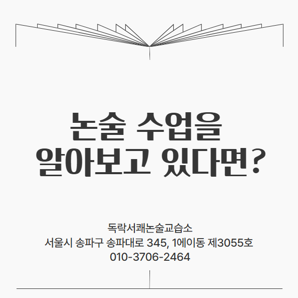 안녕하세요. 독락서쾌논술교습소입니다. 저희는 초등부터 고등까지 읽기와 사고력을 함께 키우는 방식으로 논술 수업을 운영하고 있어요. 학생의 수준과 흐름에 맞춰 단계별 커리큘럼을 구성하고 있습니다 논술의 기초는 글을 읽고 핵심을 파악하는 힘에서 시작됩니다. 글의 구조를 이해하는 과정이 안정되면 자연스럽게 생각을 만드는 능력도 확장되죠. 독서교육 관련 책을 출간한 원장님은 어떻게 읽기가 사고 확장으로 이어지는지 전문적인 수업을 진행하고 있습니다. 이런 흐름은 논술의 초반 단계를 단단하게 만드는 데 큰 역할을 합니다. 수업은 소수정예로 운영됩니다. 이런 방식은 학생마다 글을 해석하는 방식이나 표현 습관을 세밀하게....... <img src="https://blogthumb.pstatic.net/MjAyNTEyMDlfMjc3/MDAxNzY1MjQ5MjQ5NzQ4.kau_6DL7e63BwmmoR7kBFyJUVE6cI2RCg8RazPenY7Ag.LRGUBEyF-_O-wqjLFfAFYxCYrvobOWwMIq5Gfkz7tCkg.PNG/%B4%EB%C7%A5.png?type=s3" />