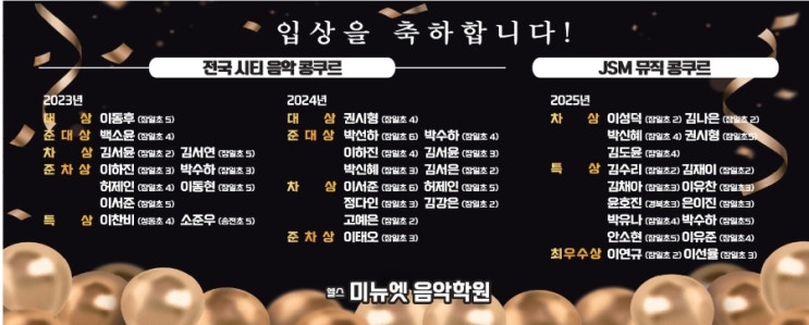 제 24회 성남시 청소년 음악경연대회 수상 소식 전해드립니다 기쁜 소식을 전해드립니다. [제 24회 성남시 청소년 음악경연대회]에서 저희 학원 학생이 수상하는 좋은 결과를 얻었습니다. 이 상장은 (아이가 다니는)학교로 전송됨으로써 담임선생님과 친구들 앞에서 뿌듯하게 공개되는 시스템! ✉️ --- 이번 콩쿠르는 짧은 시간 안에 결과를 만들어내는 대회가 아니라, ★곡을 끝까지 완성해보는 경험 ★무대에 혼자 서 보는 용기 ★긴장 속에서도 자기 연주를 해보는 도전 이 모든 과정을 스스로 해내는 것이 더 중요했던 무대였습니다. 수상 여부를 떠나 아이에게는 분명 한 단계 성장하는 시간이었습니다. 성남시 대회의 심사 방식....... <img src="https://blogthumb.pstatic.net/MjAyNjAxMThfMTk1/MDAxNzY4NzEwMjY3OTk3.oMFo4yeMGsLjaDWVUHO2USg9qHLhw8YJrb5ejORwsVkg.jUfbYDGIhF3N6VMDWJNa5GqeGo4shdMzh_3P8cnWqjUg.JPEG/KakaoTalk_20260117_160825361.jpg?type=s3" />