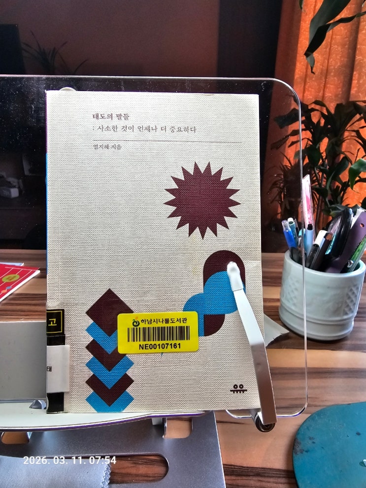 이책의 머리말 "진심보다 태도" 생각보다 몸이 먼저가는 타입인 나는 느낌대로 말한다! 행동은 즉흥적으로, 상황에 따라 다르기 마련이고 돌아오는 반성은 뼈아프다! 어떤 이의 카톡 대문에 쓰인 이 글귀 나의 결핍이었다! 항상 배려하고 신중한 카톡 주인의 성품이 배어 나오는 이 글귀는 지금 내 카톡대문 머리에도 자리한다! 그러다 도서관 책장에서 만난 이 글귀를 제목으로 한 책! 대출 기한 내에 다 못 읽어, , 반납하고 한 달 여 만에 다시 만났다! 짧은 글귀들에 위로 받고 자극 받고 확인한다! 내 취향, 내가 선했던가, 모자란가~ 이 책은 내 여러가지를 불편하지 않게 한다! 좋은 사람의 태도를 느낄 수 있게 하는 책이다! <img src="https://blogthumb.pstatic.net/MjAyNjAzMTFfMjA4/MDAxNzczMTgzNDU1NDU5.cbqOEVyo8mukytqgMIHRC79JE0MU4Vk_T7HO3zNfNdEg.cbsWdflFr_OfUeD_LMrH5-Qc0GWnXehcokb84ssHr_Qg.JPEG/900%A3%DF20260311%A3%DF075417.jpg?type=s3" />