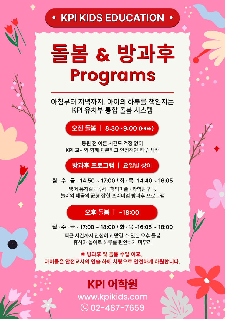 KPI 영어 유치부 통합 돌봄 시스템 퇴근 시간까지, 우리 아이의 하루를 안심하고 맡길 수 있다면 어떨까요? 그리고 그 시간이 의미 있는 하루라면요. KPI 유치부는 수업 시간만이 아닌 아이의 하루 전체 흐름을 고려한 유치부 통합 돌봄 시스템을 운영합니다. 아침 등원 전부터 방과후, 그리고 퇴근 시간까지 아이들이 혼자 기다리는 시간이 아닌 따뜻한 돌봄 속에서 휴식과 놀이, 배움이 자연스럽게 이어지는 하루를 만듭니다. 돌봄과 교육을 하나의 흐름으로 설계해 아이에게는 안정감을, 부모님께는 안심을 전합니다. 아침부터 저녁까지 이어지는 통합 돌봄 ☀️ 오전 돌봄 (무료 운영) ☀️ [운영 시간] 월~금 8:30 ~ 9:00 등원 전....... <img src="https://blogthumb.pstatic.net/MjAyNTEyMTlfMjY5/MDAxNzY2MTMwODY2OTYx.uhqGqB3z9j31godBXBE7mClLhtanKJcfbOtta9qcsNYg.GcYhmi0pUxl2OWsXpw57gaAbrcMvZ8_TSZJmUrCuubMg.PNG/%B5%B9%BA%BD%B9%E6%B0%FA%C8%C4_%BE%C8%B3%BB%B9%AE.png?type=s3" />