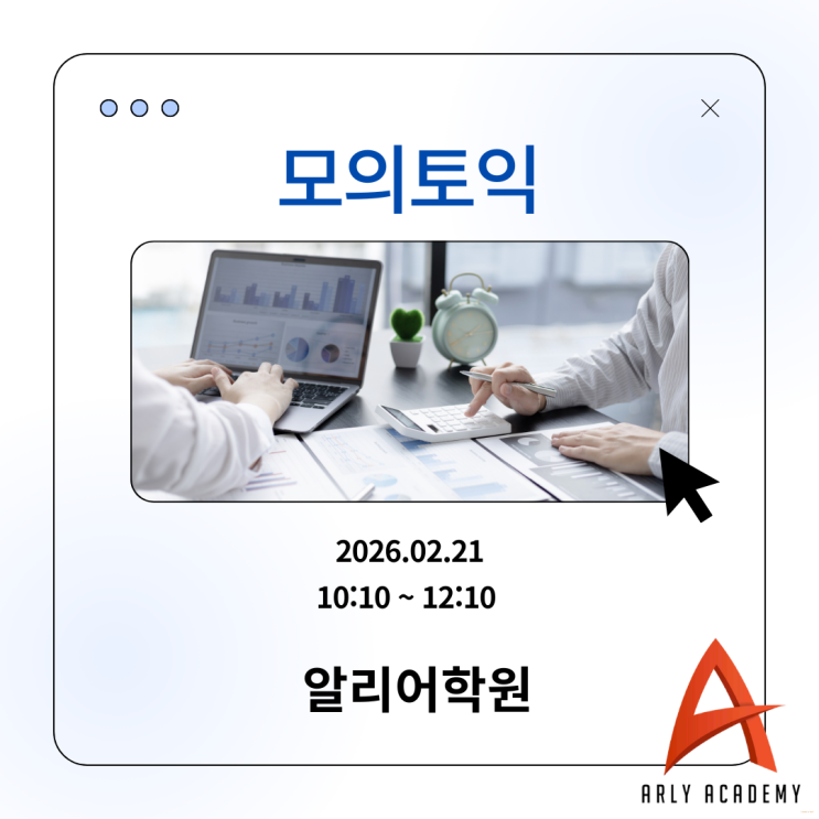 안녕하세요.^^ 김해 삼계동 토익전문 알리어학원 2026년 2월 21일 모의토익 모의토익 일시: 2026. 02. 21 A.M 10:10 ~ 12:10 실전 문제로 실시합니다. 최소 50점 Up!!! 055 724 4218 전화 및 방문 상담 환영합니다. 방문 상담 전 사전 예약 필수입니다. 김해 경전철 장신대역 도보 5분 이내 #김해토익 #김해 토익 #알리토익 #알리어학원 #김해토익학원추천 #삼계동 토익 #김해 성인 영어 <img src="https://blogthumb.pstatic.net/MjAyNjAyMjFfODUg/MDAxNzcxNjM4MDY3NDM1.7PkfrJcAme2IOkab54gv_c5E2U47M0uAKrzaoP2jsL8g.8OSUKpq_aaJigpWXwkTbQKcCm6udnEcgNxQRXvkqFGcg.PNG/%C6%C4%B6%FB_%B0%CB%C1%A4_%BD%C9%C7%C3%C7%D1_%B8%B6%C4%C9%C6%C3_%C6%AE%B7%BB%B5%E5_%C4%AB%B5%E5%B4%BA%BD%BA_%281%29.png?type=s3" />