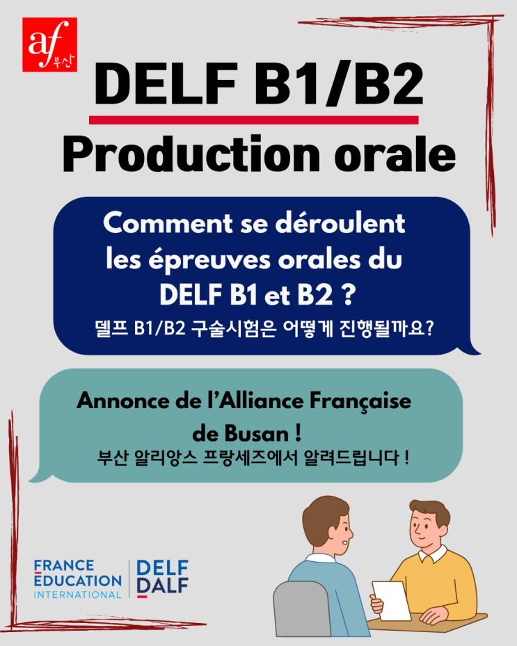 안녕하세요, 부산 알리앙스 프랑세즈입니다 . 오늘은 다가오는 DELF 시험을 준비하시는 분들을 위해 DELF B1 / B2 구술시험에 대해 자세히 소개해드리겠습니다. 두 시험은 공통점도 있지만, 준비 시간과 진행 방식에서 분명한 차이가 있습니다. 지금부터 한눈에 정리해드릴게요! 두 시험 모두 입실 전 랜덤으로 기사 주제 2개를 뽑은 뒤 1개를 선택하게 됩니다. 가장 큰 차이점은 준비 시간과 시험 시간, 그리고 토론의 난이도입니다. B2는 준비 시간도 길고 구술 시험관도 2명이기 때문에, 보다 논리적이고 체계적인 답변이 요구됩니다. 우선 B1 구술 시험에 대해 자세히 소개해드리도록 하겠습니다. DELF B1 구술시험 구성 안내 DELF B1 구....... <img src="https://blogthumb.pstatic.net/MjAyNjAyMjhfNTIg/MDAxNzcyMjQ3NzIzNjA5.iNpXgBfqZ6vOo-Sjlx4Dk8wfVlpCP2h1u3oIudzVkdcg.AVaofxfHWBiL43bQGUokSniFeCQHjEx-KWGV7sM9Ypkg.PNG/Comment_se_d%26eacute%3Broulent_les_%26eacute%3Bpreuves_orales_du_DELF_B1_et_B2__%281%29.png?type=s3" />