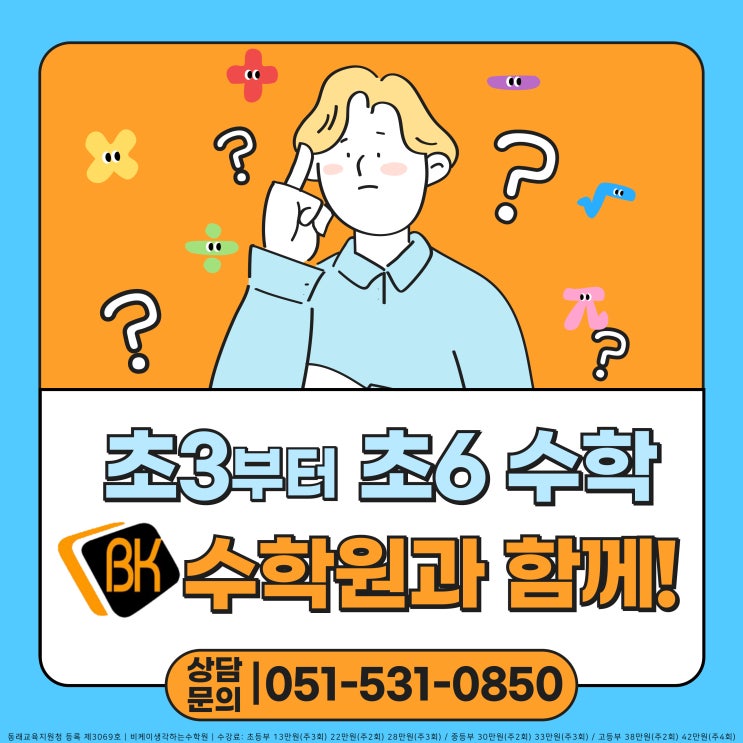 안녕하세요 BK생각하는수학원입니다! 많은 학부모님들이 “수학은 언제부터 제대로 시작해야 할까요?”라고 질문하십니다. 결론부터 말씀드리면 초등 3학년부터 초등 6학년까지가 수학 실력을 만드는 가장 중요한 시기입니다. 그리하여 BK도 올해부터 초3 친구들 수업을 시작했습니다! 초3부터 대표적으로 배우는 교과 내용은 ✔️ 곱셈과 나눗셈 개념 ✔️ 분수의 기초 ✔️ 길이와 시간, 들이 단위 ✔️ 다양한 문장제 문제 이때 개념을 제대로 이해하지 못하면 이후 학년에서 계속 어려움을 느낄 수 있습니다. 이 시기에는 단순한 계산을 넘어 곱셈·나눗셈 완성 / 분수와 소수 개념 이해 도형과 측정 단원 / 문장제 문제....... <img src="https://blogthumb.pstatic.net/MjAyNjAzMTNfMTkx/MDAxNzczMzkzMDE4Mjg5.-GwnLtcIkl5Rh3DLPQZ5CMmJ2Cfo8kTj7vQMVJm2xu0g.TEGd2pN7D1uK67pYgWqQ4Gjfw-NmP7unVD6ru2F_Wr4g.JPEG/001.jpg?type=s3" />