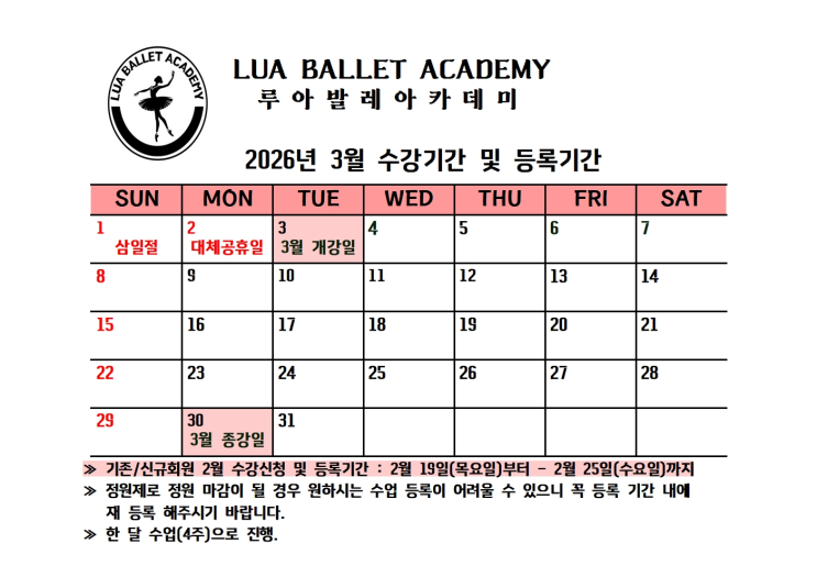 명지발레, 루아발레학원 2026년 3월 개강일자 및 수강등록기간