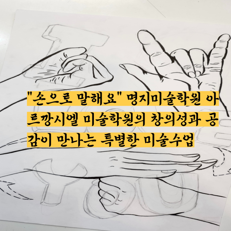 안녕하세요, 명지미술학원 아르깡시엘 미술학원입니다! 저희 학원에서는 최근 ‘손으로 말해요’ 라는 특별한 주제로 수업을 진행했습니다. 이 수업은 손을 통해 소통하는 방법, 즉 수업에 대해 이야기하고 표현하는 시간을 가졌습니다. 각 연령대에 맞춘 재미있고 창의적인 활동을 통해 학생들은 새로운 표현의 기쁨을 느낄 수 있었습니다. 아이들은 손동작을 그림으로 표현하며, 손을 통해 말하는 방법을 배웠습니다 어린 학생들에게 수어라는 새로운 언어를 접하며 다양성을 존중 하고 이해하는 계기를 마련해 주었습니다 초등 2학년 학생들은 수어로 방송하는 아나운서의 모습을 상상하고 표현하며, 실생활에서의 수어의 중요성과 활용을 배....... <img src="https://blogthumb.pstatic.net/MjAyNjAyMjNfMjYy/MDAxNzcxODU1MDA3NjI0.GPudw5ps-9_2SGtQ1Az26aTe3GR2A77De8bU7RjsaZEg.it0TRkIw7Qr4xIgYQ8q_pNVaEoeNlQKiN_gCb-u2BhMg.PNG/%C1%A6%B8%F1%C0%BB-%C0%D4%B7%C2%C7%D8%C1%D6%BC%BC%BF%E4_-001_%2860%29.png?type=s3" />