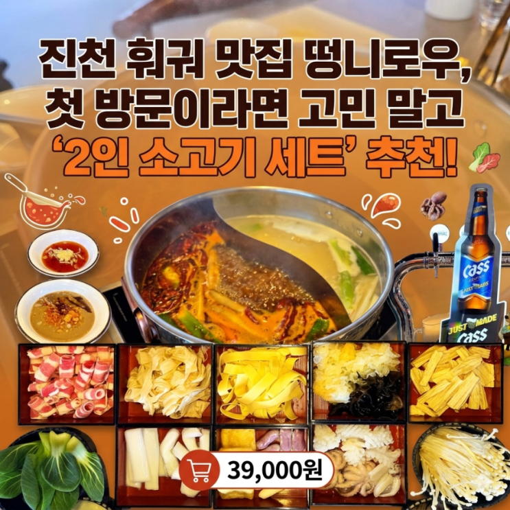 안녕하세요! 오늘은 진천에서 훠궈를 가장 풍성하고 즐겁게 즐길 수 있는 곳, '떵니로우'를 소개해 드립니다. 요즘처럼 입맛 당기는 날에는 알싸한 훠궈 생각이 간절해지죠. 진천에 위치한 훠궈 전문점 떵니로우는 깔끔한 매장과 신선한 재료, 그리고 무엇보다 파격적인 혜택으로 사랑받는 곳입니다. ■ 고민 없이 선택하는 '2인 소고기 세트' 떵니로우에 처음 방문하신다면 '2인 소고기 세트'를 강력 추천합니다. 39,000원이라는 가격이 믿기지 않을 만큼 구성이 알찬데요. 신선한 소고기는 물론이고 각종 야채, 버섯, 면, 완자까지 한 상 가득 차려집니다. 사진만 봐도 재료 하나하나의 퀄리티가 느껴지시죠? 입....... <img src="https://blogthumb.pstatic.net/MjAyNjA0MjhfMjI4/MDAxNzc3MzM1NjQ0Nzcz.QGIYNO63MZK9lXDvOHD5yC2hVlkKfdwjQBIZVtS8zQog.eUSfm2R7wsJxxPV7N1KEW2nPAK2lm30MXPjjoY655CIg.PNG/900%A3%DF1777335485590.png?type=s3" />