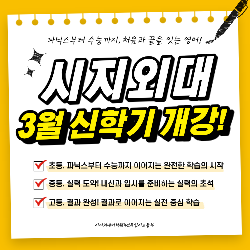 2026년 3월 신학기는 성장을 준비하는 출발선입니다! 신학기는 단순히 새 학년이 시작되는 시점이 아니라, 그동안의 학습을 돌아보고 앞으로의 방향을 새롭게 세우는 성장을 준비하는 출발선입니다. 시지외대어학원의 신학기 수업은 영어를 처음 시작하는 초등부터 중·고등 내신과 수능까지 하나의 흐름으로 자연스럽게 이어지며 초등·중등·고등이 단계별로 연결되어 아이들이 흔들림 없이 꾸준한 성장과 결과를 만들어 갑니다. 이번 신학기, 파닉스부터 수능까지 처음과 끝을 잇는 영어 시지외대어학원과 함께 시작해 보세요. 초등:기초 확립의 시기 초등 과정은 읽고 이해하는 영어의 기준을 세우는 시기입니다. 파닉스를 포함한 초등 영어 수....... <img src="https://blogthumb.pstatic.net/MjAyNjAyMTFfODUg/MDAxNzcwNzkzODczMTY2.ki4lnjwh3LQtlER0O6YXPyavqGBIAqUcAwWmYwcDCoIg.0QvJI6R0VR6wRFY39VNqHwUaWaMCQGnfSgFJr-QkLOkg.PNG/26_%C6%C4%B4%D0%BD%BA%2B%BD%C5%C7%D0%B1%E2_%B0%B3%B0%AD.png?type=s3" />