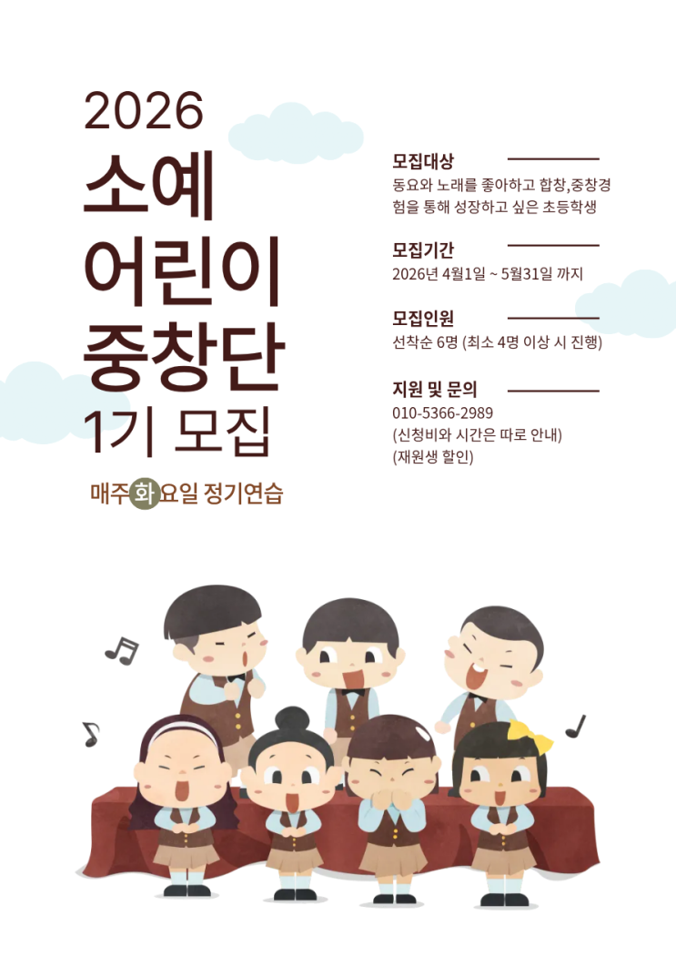 안녕하세요 소예음악학원입니다:) 올해부터 새로운 동요 선생님이 함께하시며 동요 수업이 더욱 알차고 새롭게 바뀌었습니다 새롭게 중창단 단원과 동요 수업 수강생을 모집하오니 많은 관심 부탁드립니다 풍부한 지도 경험과 전문성을 바탕으로 아이들의 목소리와 개성을 살린 체계적인 맞춤 지도를 진행해 주실 선생님입니다✨ 아이들이 음악을 즐기며 자연스럽게 성장할 수 있도록 따뜻하고 섬세한 레슨으로 함께합니다 소예 어린이 중창단 1기 모집 ✔ 모집대상 - 동요를 좋아하고 노래 부르기를 즐기는 초등학생 ✔ 모집인원 - 6명 (※ 4명 이상 모집 시 진행) ✔ 모집기간 - 2026년 4월 1일 ~ 5월 31일 ✔ 레....... <img src="https://blogthumb.pstatic.net/MjAyNjAzMjBfODEg/MDAxNzc0MDAwODc2NzQ4.5crwUOgf7kSxcTGT7eSxSs6nFVeqlstt02KynSk59esg.YS_BYqvEMe_qadbHBhpkfAW-QcRY9TIzy9-QiG83_R0g.PNG/%C1%A6%B8%F1%C0%BB_%C0%D4%B7%C2%C7%D8%C1%D6%BC%BC%BF%E4._14.png?type=s3" />
