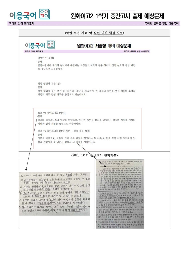 이응국어학원에서는 매 시험마다 해당 시험범위에서 학교 출제경향을 고려한 변형 포인트를 제공하고 직전대비때 학생들에게 확인 질문을 합니다. 시험기간 중간에 지금까지 배웠던 내용에 대해 학원 자체 서술형평가를 통해 학생들이 정확한 개념을 미리 공부하고 있는지를 점검 합니다. 또한 원화여고1학년부터 3학년까지의 문제 유형들을 종합하여 무조건 나올만한 내용들에 대해 집중 설명합니다. 이외 이번 문법내용들은 수업시간에 강조한 필기내용이 있으며 수학여행기간을 포함한 전체 시험기간중 4번의 개념설명을 통해 개념을 완전히 암기 할 수 있도록 했습니다. 이응국어학원에서는 다른 학원은 따라하지 못하는 이응국어학원의 유능....... <img src="https://blogthumb.pstatic.net/MjAyNjA0MjhfMjE0/MDAxNzc3MzU4NzcyODAz.ezvhIFnKp7ua8cYdQpZtTDUVbN8RW-tUutGnx2_2mswg.fGoUbbXfLyQBEZ-KQjS8CL145t_8Y6feqbXu-o2OeI8g.JPEG/%BF%F8%C8%AD2_%C0%FB%C1%DF_%C6%E4%C0%CC%C1%F6_1.jpg?type=s3" />