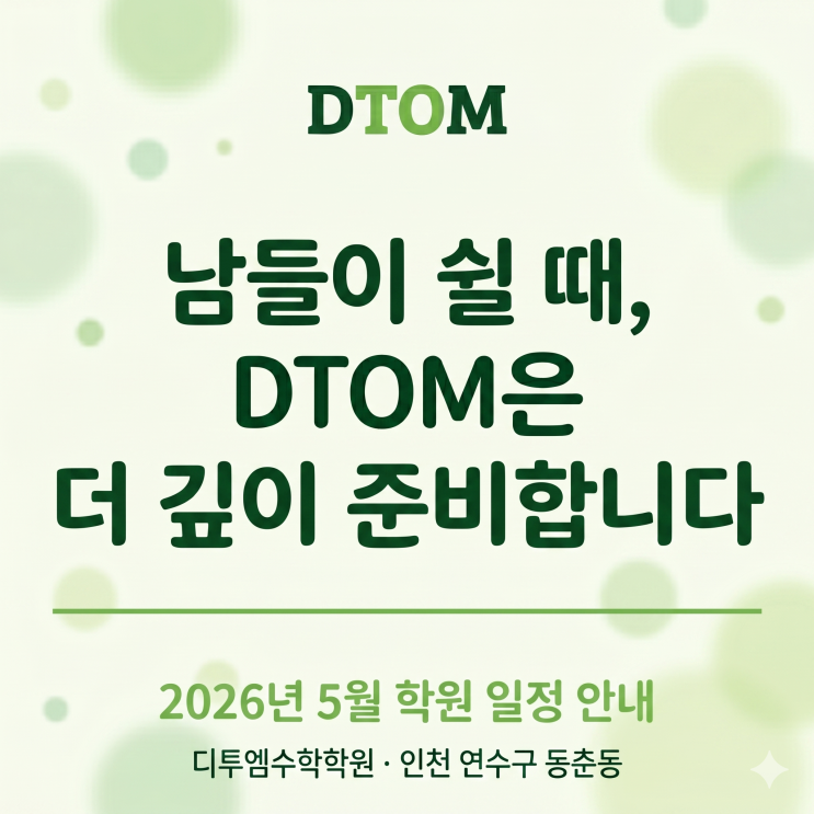 안녕하세요, 인천 연수구 동춘동 DTOM(Dive To Math) 수학학원입니다. 5월은 1일 근로자의 날부터 어린이날, 대체공휴일까지 달력이 빨간 날로 가득합니다. 많은 학원들이 이 기간을 '쉬어가는 시간'으로 쓸 때, DTOM은 조금 다른 선택을 합니다. 연휴가 길수록, 준비는 더 촘촘해야 한다고 믿기 때문입니다. DTOM 5월 주요 일정 5월 DTOM이 다른 이유 하나. 수업이 없는 날, 밀도 높은 상담이 열립니다 5월 4일은 정규 수업이 없는 날입니다. 그런데 DTOM은 바쁘게 돌아갈 예정입니다. 원장님이 직접 중1 진로 컨설팅과 재원생 개별 상담을 진행합니다. 하루 전인 5월 3일, 서울에서 열리는 전국 학원 원장 전문 교육에 참석하고 그곳....... <img src="https://blogthumb.pstatic.net/MjAyNjA0MjJfMTgy/MDAxNzc2ODE4NzIxNDA1.fIOewBJ-fARZbCHNaWC3uZwX9onvZm3Om5gCF4KzODEg.40lAacI-HuUJp1YHu4KeQXUecA-HUoGnfB871K5XYRMg.PNG/5%BF%F9_%C7%D0%BB%E7%C0%CF%C1%A4_%B8%DE%C0%CE_.png?type=s3" />
