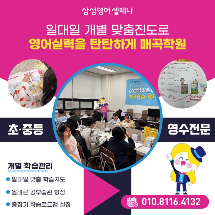 나에게 맞는 일대일 맞춤 영어수업 삼성영어셀레나 매곡학원 안녕하세요! 우리 아이의 처음 영어, 어떻게 시작하고 계시나요? ^^ 광주 북구 매곡동에는 수많은 영어, 수학 학원이 있습니다. 이렇게 많은 학원 중에서도 내 아이에게 딱 맞는 영어, 수학 학원을 찾기란 정말 쉽지 않습니다. 똑같은 교재로 칠판을 바라보는 다대일 수업에서는 우리 아이가 학습 주도권을 가질 수 있을까요? 진짜 영어 실력을 키우기 위해서는 학생 스스로 학습의 주도권을 갖는 자기주도학습 습관이 무엇보다 중요합니다. 오늘은 학생 개개인의 수준에 딱 맞춘, '나에게 맞는 일대일 맞춤형 영어수업!'을 운영하고 있는 삼성영어셀레나 매곡 학원만의 영....... <img src="https://blogthumb.pstatic.net/MjAyNjAzMDlfOTIg/MDAxNzczMDUyMzUxMDg1.XukPcdI3zObswN6k5M-Rl10q6VPkBLEu0Q7mR0cFfJ4g.5kdoRnbWzBvZRi8xwJmQd2kJ7WEqXyumQmWHQA2L3M4g.JPEG/%C5%B8%C0%CC%C6%B2.jpg?type=s3" />
