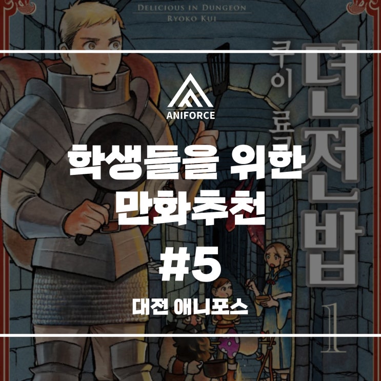 안녕하세용~! 대전 애니포스 만화학원입니다 오늘은 오랜만에 학생들을 위한 만화 추천 포스팅 #5로 돌아왔는데요!! 쌤들이 직접 본 재미가 보장된 만화들이 많이 올라올 예정이니 앞으로도 기대해주세요~! 이번 작품은! 던전밥 쿠이 료코 [줄거리] 기다려라 드래곤, 스테이크로 만들어주마! 던전 깊은 곳에서 드래곤에게 습격당해 돈과 식량을 잃고 만 모험자 라이오스 일행. 다시 던전에 도전하려 해도 이대로 가면 도중에 굶어죽어버린다...... 거기서 라이오스는 결의한다. "그래, 몬스터를 먹자!" 슬라임, 바실리스크, 미믹, 그리고 드래곤!! 덮쳐오는 흉폭한 몬스터를 먹으면서 던전 돌파를 노려라! 모험자여!! 라이오스 토덴 마....... <img src="https://blogthumb.pstatic.net/MjAyNjAyMjhfMTY5/MDAxNzcyMjUwNjQ5Mzcx.BTZlpcqIbEsMFmT56livYpnnYzm3WjGxtkhoakXdFXcg.WqgySMLumtzObXYftNFOlKNvssFaRahwPhdiMCucDOEg.JPEG/22.jpg?type=s3" />