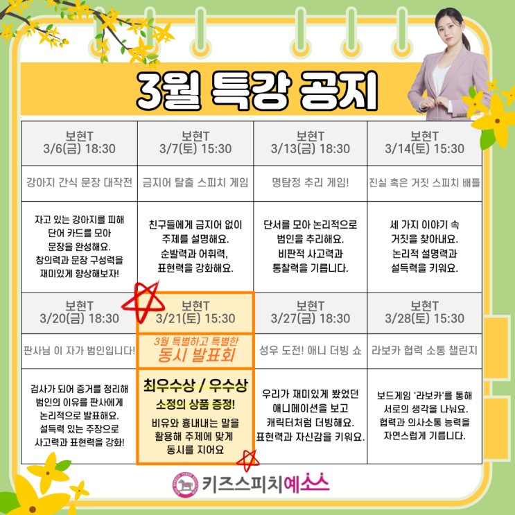 새 학기가 시작되는 3월, 부모님들 마음속에는 이런 질문이 떠오릅니다. “새 학년이 되었는데, 우리 아이 무엇을 더 준비해줘야 할까?” 교과 공부도 중요하지만 요즘 특히 많이 상담 주시는 부분은 아이의 말하기 자신감과 표현력입니다. 생각은 많은데 정리가 안 되어 말이 끊기거나, 친구들 앞에 서면 목소리가 작아지고, 발표 시간이 다가오면 괜히 긴장하는 모습은 학년이 올라갈수록 더 또렷해지기 때문입니다. 이러한 고민을 가진 부모님들의 요청으로 3월 토요일 스피치 특강을 오픈하게 되었습니다. 신청 안내 신청 방법 : 문자 / 전화 / 방문 (선착순 마감) 신청 예시 : 홍길동 상명초 4학년 / 3월 21일 특강 (이름, 학교·학년, 신청....... <img src="https://blogthumb.pstatic.net/MjAyNjAyMjhfMjkx/MDAxNzcyMjY0NjI5OTM0.Pi-cRpbl9_zodW-3s50oI6Kc091ZRZqxNbtCJI78Xpsg.9VtmavgWqWb-Pd28KYp4_jRswcD9FnRkLgNs1GrqiQsg.PNG/2026%B3%E23%BF%F9%C6%AF%B0%AD%B0%F8%C1%F6.png?type=s3" />