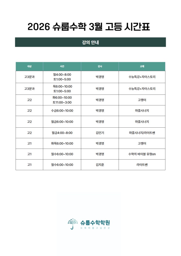 모든 수업은 주3회가 이루어집니다. 위의 요일은 판서 수업이 있는 요일이며, 일반적으로 주말을 이용해서 클리닉이 이루어집니다. ( 주말이 안되는 경우 평일 클리닉도 가능) 모든 클리닉 수업은 고등부 원장과 조교선생님들이 함께 합니다. 그 어느 학원보다 수준 높고 꼼꼼한 클리닉을 통한 관리를 자신합니다. <img src="https://blogthumb.pstatic.net/MjAyNjAzMDlfNTkg/MDAxNzczMDMxOTU1NjQ5.ZbU1Kh1v5mZGJxNYyfNce1pzbLyWlHCEadkzpwx-dsYg.3HsVjlmNvazl6DHoe010FFFxcr-dppz8h0v5yEETfaIg.JPEG/3%BF%F9_%B0%ED%B5%EE%BA%CE.jpg?type=s3" />