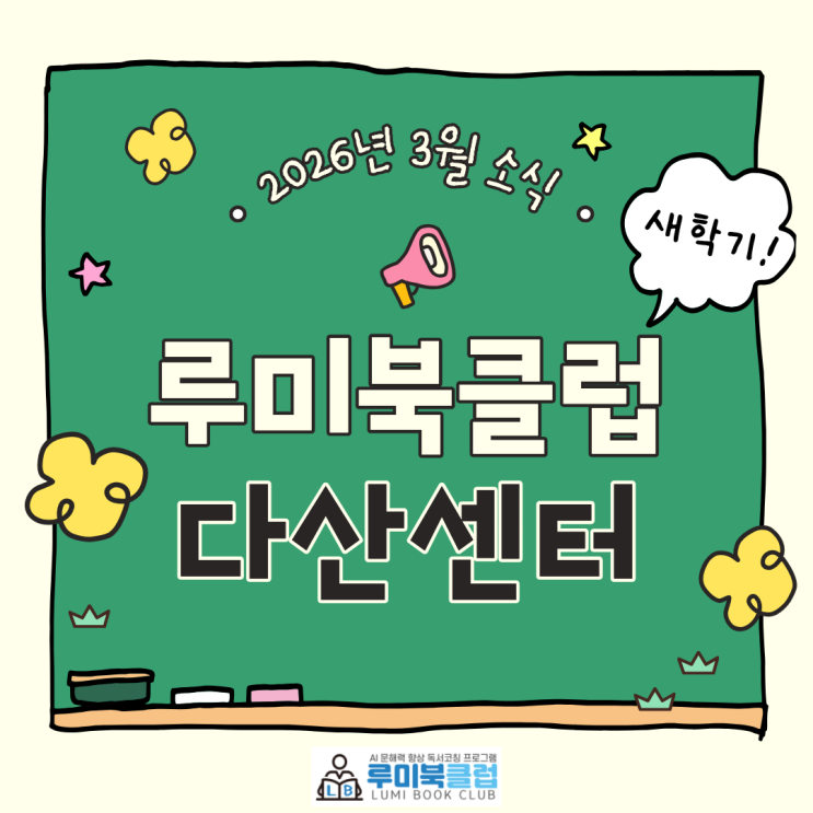 안녕하세요. 아이들의 생각을 키워주는 생각코치 루미쌤입니다✨ 긴 겨울방학이 끝나고, 아이들의 발걸음이 다시 학교로 향하는 3월이 다가왔습니다. 방학임에도 늘 부지런하게 독서를 하던 아이들이 참으로 기특할 따름입니다. 3월 독서는 새로운 시작 앞에서 마음을 정리하고 스스로를 믿는 힘을 키워가는 시간입니다. 새로운 교실과 새로운 자리, 새로운 친구들을 만날 아이들을 응원하며, 아이들의 시작이 조급함이 아닌 기대와 자신감으로 채워지기를 바랍니다 1. 루미북클럽 다산센터 3월 일정 루미북클럽다산센터 2026년 3월부터 2026년 5월까지 수업 일정 공지합니다. 3월 3일 (화)에 3월 첫 수업이 시작됩니다. 3월 30일 (월)을 마....... <img src="https://blogthumb.pstatic.net/MjAyNjAyMjdfMTE0/MDAxNzcyMTYzMjg5Mjc2.ShPplvsrkAtFgLCjk4Nc_lhx-tnXbzY0ldCyyJ_EL2sg.641gIixViwTNUxXFfhOZZySyeHvsO3wkxfS0qATz6zwg.PNG/1.png?type=s3" />