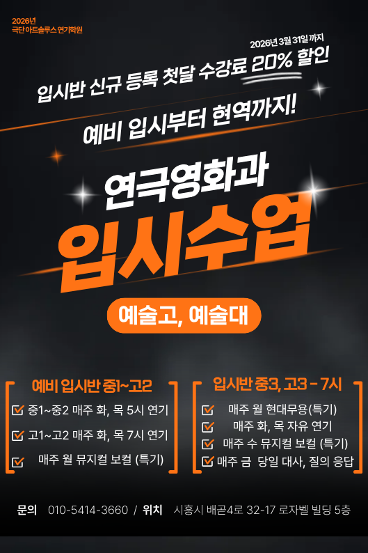 학원명 : 극단 아트솔루스 연기학원 학원등록 번호 : 제 1525호 학원비 : 15만 ~ 70만 ( 취미, 오디션, 입시 ) 안녕하세요 극단 아트솔루스 연기 학원입니다. 새학기를 맞이하여 연극영화과를 꿈꾸는 예비 배우님들을 위하여 2026년 3월 31일 안에 입시반 신규 등록하는 학생들에 한하여 20% 수강료 할인 이벤트를 진행합니다! 성적이 낮은데 연극영화과 가능할까요? 한번도 연기를 배워 본적이 없는데 입시 가능할까요? 입시에 대해 전혀 모르는데 괜찮을까요? 언제든 편하게 문자, 카톡, 전화 문의 주세요! 입시 수업외 취미, 오디션반은 가장 밑에 글을 읽어주세요~ 1. 초, 중등 취미반 수업 (초5~중3) - 토요일 12시 - 토요일 15시 2. 초,중....... <img src="https://blogthumb.pstatic.net/MjAyNjAzMDdfMjk2/MDAxNzcyODYyODIxMzgz.yAnoHxLDXM2_4T2d0xzbLizJQDt4EN_ws4Iw_PosQ48g.r-6UMBD_6ouzhj1AV4p9MSciQOEwM7lL1y3uda4UuJog.PNG/20_%C7%D2%C0%CE.png?type=s3" />
