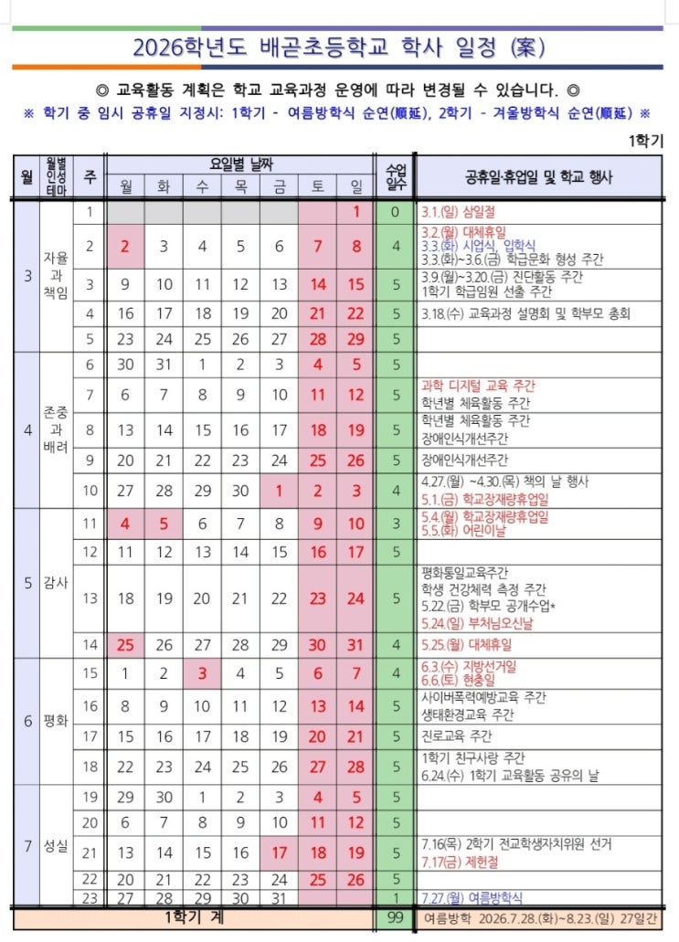 배곧초 2026년 학사일정 (방학 및 재량휴업일)
