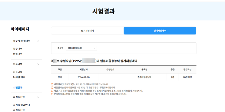 [시흥컴퓨터학원/시흥3d학원]2026년 2월 10일 컴퓨터활용능력2급 실기 합격자발표(군자컴퓨터정보처리학원)