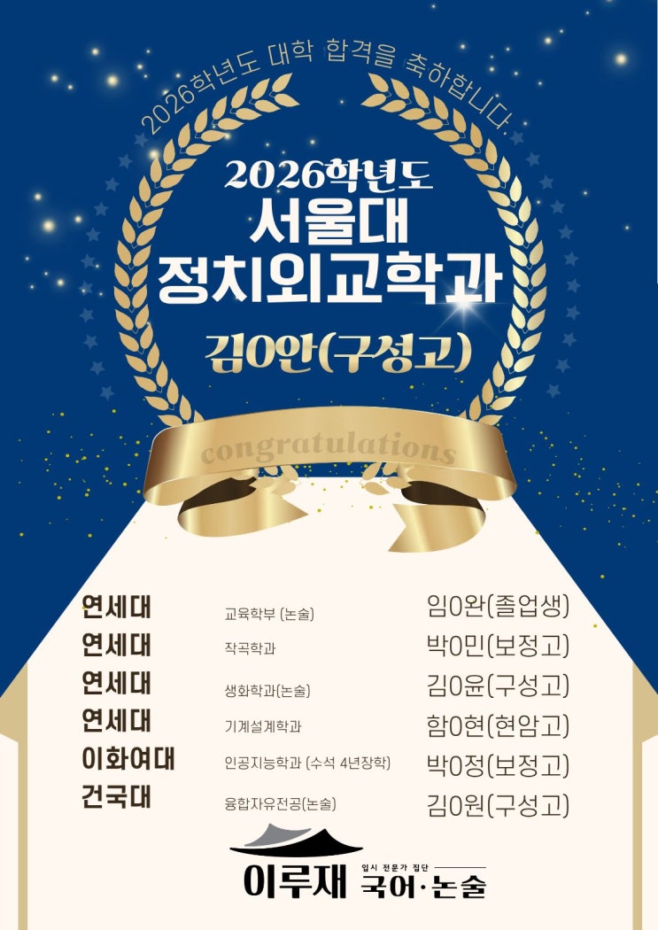 이루재 국어학원 2026학년도 대입 주요 합격 결과 안녕하세요, 이루재 국어학원입니다. 2026학년도 대학입시에서 우리 학생들이 값진 결실을 맺었습니다. 끝까지 포기하지 않고 노력해준 학생들과 믿고 맡겨주신 학부모님들께 진심으로 감사드립니다. 각 합격 후기는 블로그에서 확인할 수 있습니다. 상담문의: 031) 548- 0953 (월,화 휴무) <img src="https://blogthumb.pstatic.net/MjAyNjAyMjhfMTg5/MDAxNzcyMjYzOTk2MTU2.rvbRsMJzSr5Ycszp9L26QfEJWjCjYQS_ISZ_o8plHbgg.Wddt_kMSr1dCuqd3UR79et9Ej7IgVrdxJUK6_M17Tu4g.JPEG/6.jpg?type=s3" />