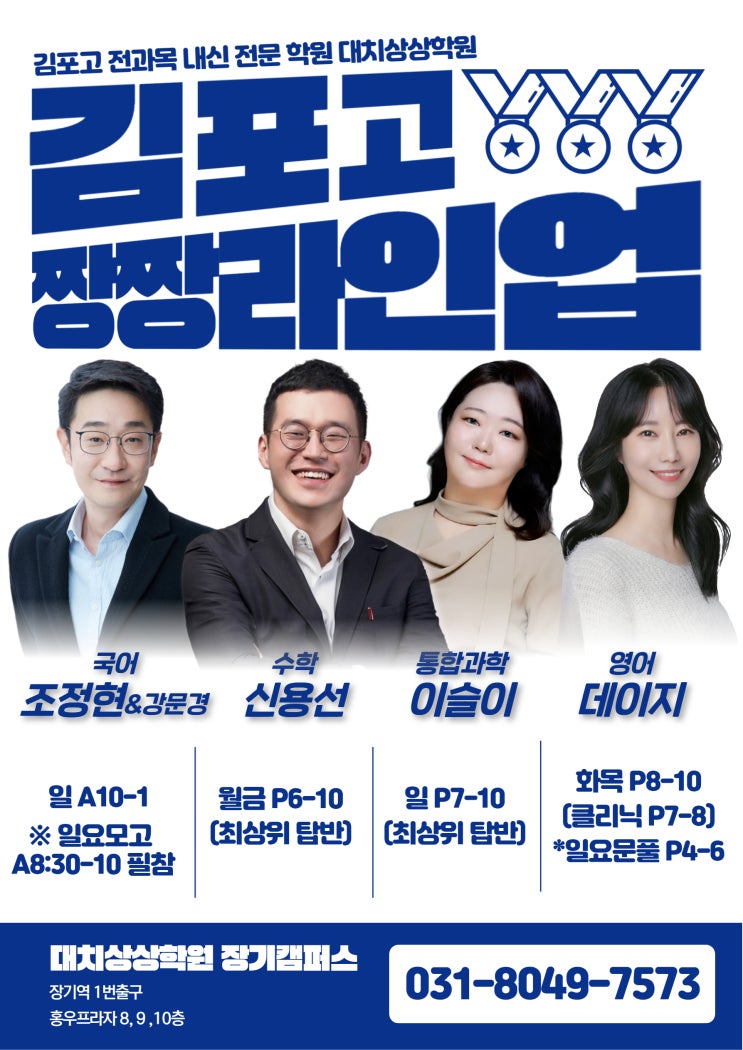 멀리 갈 필요 없습니다. 장기동에 김포고 전문가가 있습니다 김포고 내신은 일반고를 넘어선 방대한 범위와 높은 난이도로 유명하기에, 시작부터 '전문가'와 함께하는 전략이 필요합니다. 장기동 대치상상학원에서는 대치, 목동, 마포 등 서울 주요 학군지에서 전교 1등 신화를 써 내려온 베테랑 강사진이 김포고 학생들만을 위한 최상위 내신 드림팀을 구성하였습니다. 분석된 시험 실체와 함께 상세 강의 일정을 안내해 드립니다. 김포고 내신 분석 & 전략 및 일정 1. [수학] 신용선T – 고대 수학교육 석사, 심화 문풀의 정석 전문 경력 : 고려대학교 수학교육 전공 석사 및 정교사 자격증을 보유한 실력파로, 성북 종로와 일산....... <img src="https://blogthumb.pstatic.net/MjAyNjAyMjhfMjg1/MDAxNzcyMjM5ODgwMTA1.gpe5gHJy9X2sht1UMptV66PvnMblIhfOs4T4Vd2B-Dsg.cm5yt7GxdzsqC4PmPavZ0eHLox7cr3iiWmil7fP0y-gg.JPEG/%B1%E8%C6%F7%B0%ED_%C6%CA%C7%C3%B7%BF.jpg?type=s3" />