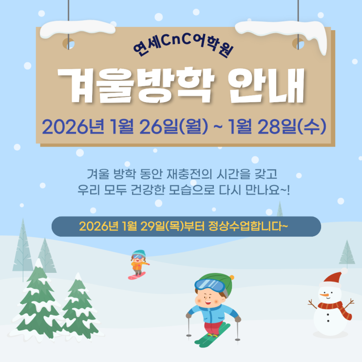 안녕하세요~ 연세CnC어학원입니다. 2026년 새해를 맞아 학생과 학부모님 휴가 일정을 위해 미리 겨울방학 학원 운영 일정을 안내해드립니다. 겨울방학 : 2026년 1월 26일 (월) ~ 1월 28일 (수) 등원일: 2026년 1월 29일 (목) 지난 한 해 동안 변함없는 믿음과 응원으로 함께해 주셔서 감사합니다. 2026년에도 아이들 한 명 한 명의 성장을 소중히 여기며 한 걸음씩 함께 나아가는 연세CnC어학원이 되겠습니다. 새해 복 많이 받으세요~ <img src="https://blogthumb.pstatic.net/MjAyNTEyMzFfMjk5/MDAxNzY3MTY4ODcyMDkw.cqWs0rGkWSGpzs_KjomxjllE23pNoxkwpEqI7DRS7E4g.8pgA9GPfSywJCsnbUKGaT-G3uOZ0JeEp7gVN38RMULAg.PNG/겨울방학안내문.png?type=s3" />