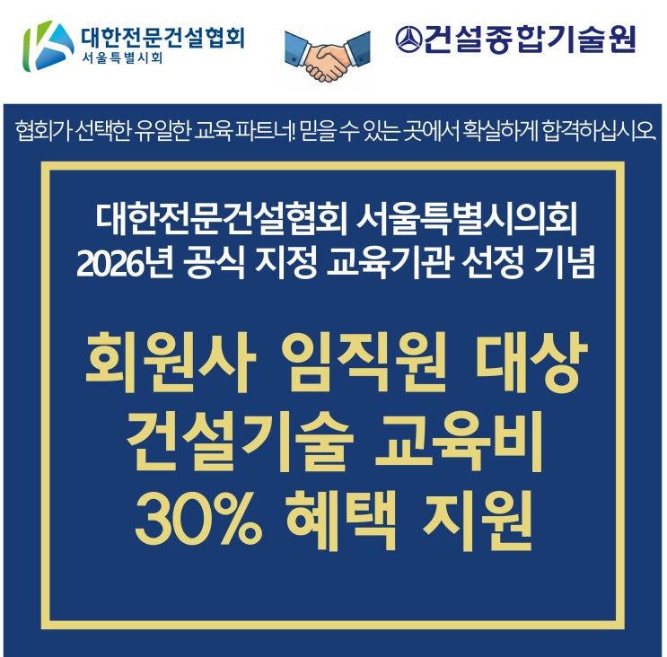 건설사 대표님, 그리고 현장 기술력을 높이고자 하는 임직원 여러분 안녕하십니까. 건설종합기술원(건설기술협력회)입니다. 2026년 1회차 시험 접수를 코앞에 둔 시점, 아주 반가운 소식을 들고 왔습니다. 우리 기술원이 대한 전문건설협회 서울특별시회와 손을 잡고 건설업 기술자 양성을 위한 공식 협력을 체결했습니다. 단순한 협약을 넘어, 협회 회원사분들께만 드리는 특별한 교육비 혜택까지 준비했으니 이번 포스팅을 꼭 끝까지 확인해 주시기 바랍니다. 전문건설인이 인정한 교육 퀄리티 저희 건설종합기술원은 지난주, 대한전문건설협회 서울특별시회와 건설업 관련 기술자 양성을 위한 업무 협약을 체결했습니다. 이번 협약은 단순히 서....... <img src="https://blogthumb.pstatic.net/MjAyNjAxMjNfMTA1/MDAxNzY5MTUxMjkwOTIy.nGe_Nd0psQo-PnIII87rjFErNVQSwzApHWIy0D-S0uwg.PRv7H0RhypDzDgiY0cIfJvfXsAoaSv48Fo5kVQWVHYwg.JPEG/%B4%EB%C7%A5%BB%E7%C1%F8.jpg?type=s3" />