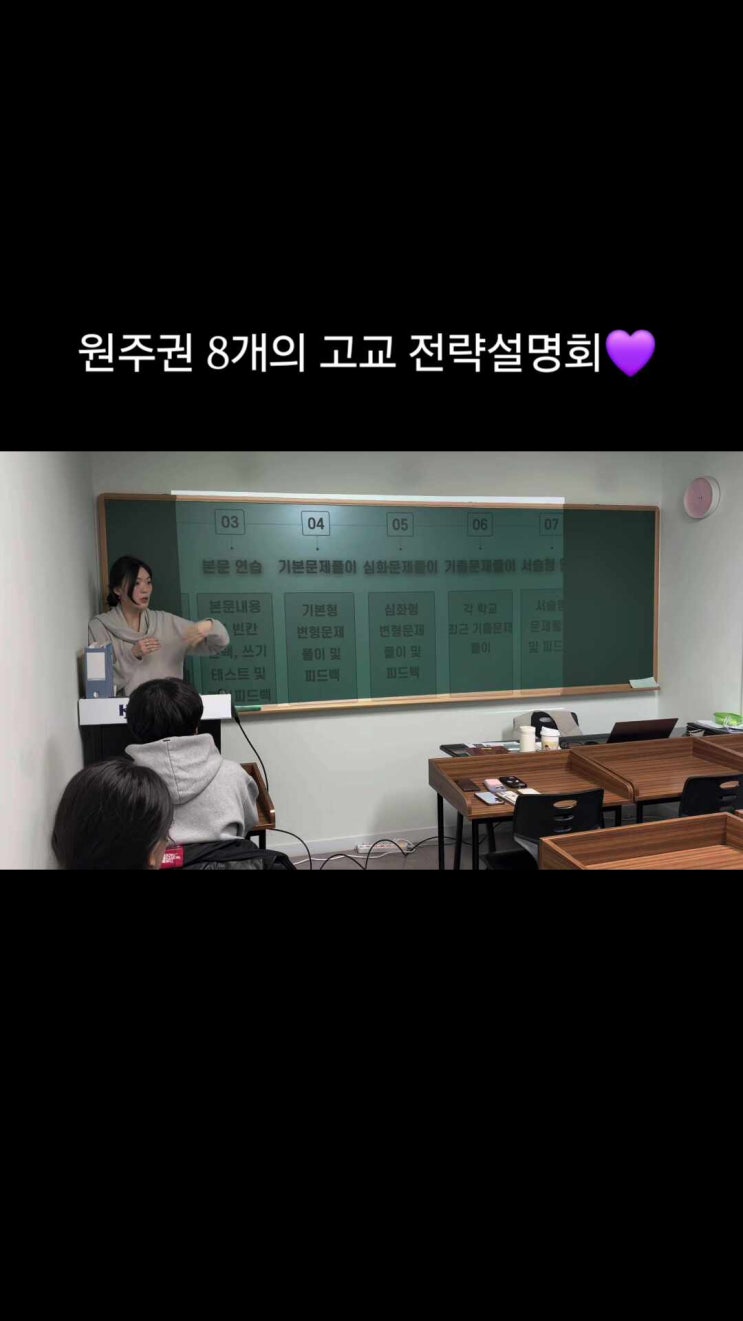 치악고 진광고 원주고 원주여고 상지여고 대성고 북원여고 육민관고 **원주권 8개의 고교 전략 설명회** - 작년 담당선생님의 최근 3년 기출분석 - 재원/졸업생들의 도움을 받아 고교별 특징 - 2028 대입에서 살아남기 - 원고출신 경희대 정치외교학과 임운수 선배, 치악고출신 강원대 수의학과 김현웅 선배 와의 대화 - 각 학교 교과서 맛보기 수업 탄탄한 선배들이 있고, 실력과 열정이 있는 #김정은영어학원강사진 이 있으니, 그 어느학교를 배정받아도 걱정하지 말라던 원장샘의 말, 이제 진짜 믿을 수 있겠지? 그러니 안심하고 따라와. #입벌려_1등급들어간다 #입시영어는_김정은영어학원이_잘_합니다 #어차피_영어는_김정은영어?....... <img src="https://phinf.pstatic.net/image.nmv/blog_2026_01_25_65/8XgF0QhChp_03.jpg?type=f480x480" />