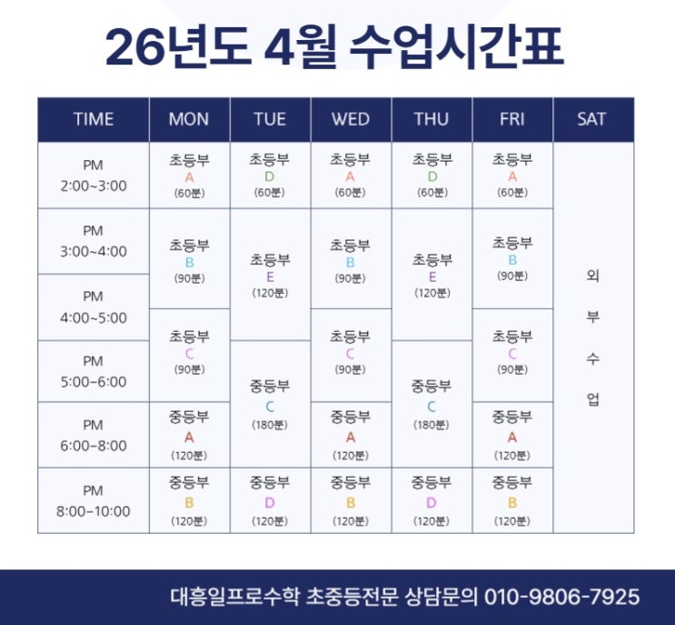 안녕하세요. 1%의 차이로 100%를 바꾸는 교육을 실현하는 <대흥일프로수학>입니다. 겨울의 끝과 새학기의 문턱에서 그동안의 준비를 점검하고 다음 단계를 향해 나아길 힘을 다지는 시간입니다. 쌓아온 하루하루의 노력이 다가올 한해의 방향을 또렷이 만들어, 여러분의 깊이 있는 성장으로 이어지길 바랍니다. <대흥일프로수학>은 이 중요한 시기에 함께하며, 앞으로도 변함없이 여러분의 발걸음을 응원하겠습니다. 26년 4월 운영되는 수업과 시간표를 공지합니다. 3월 현재 초등부B반 마감되었습니다. 4월 대기 가능합니다. 중등부A, C반 1자리 남아있습니다. 시간표 수업 외 개인 사정으로 시간 또는 요일 조정은 어렵습니다. 면....... <img src="https://blogthumb.pstatic.net/MjAyNjAzMDFfNTcg/MDAxNzcyMzIzNzg2Njg3.j4Id-5JN5Ahuh8Tx3lXEmin_l03r0-WPNdPLykfxy1wg.tqfyIO703DwfD7SS4cPsR4sLQ12P0HWou8dUAZjVu-Ag.JPEG/3%BF%F9_%BD%C3%B0%A3%C7%A5-001_%281%29.jpg?type=s3" />