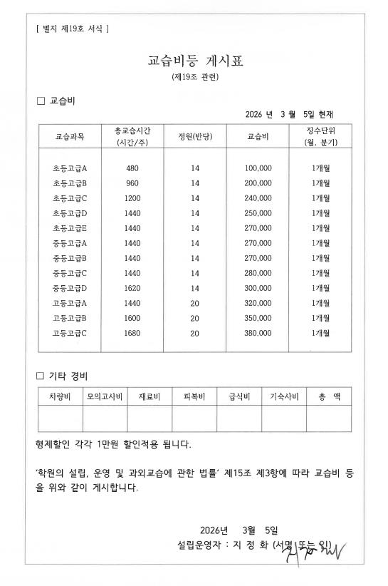 에이프릴어학원 경북옥계캠퍼스/씨엘에이 어학원 산동캠퍼스/ April & 꿈스 씨엘에이교육 교습비등 게시표