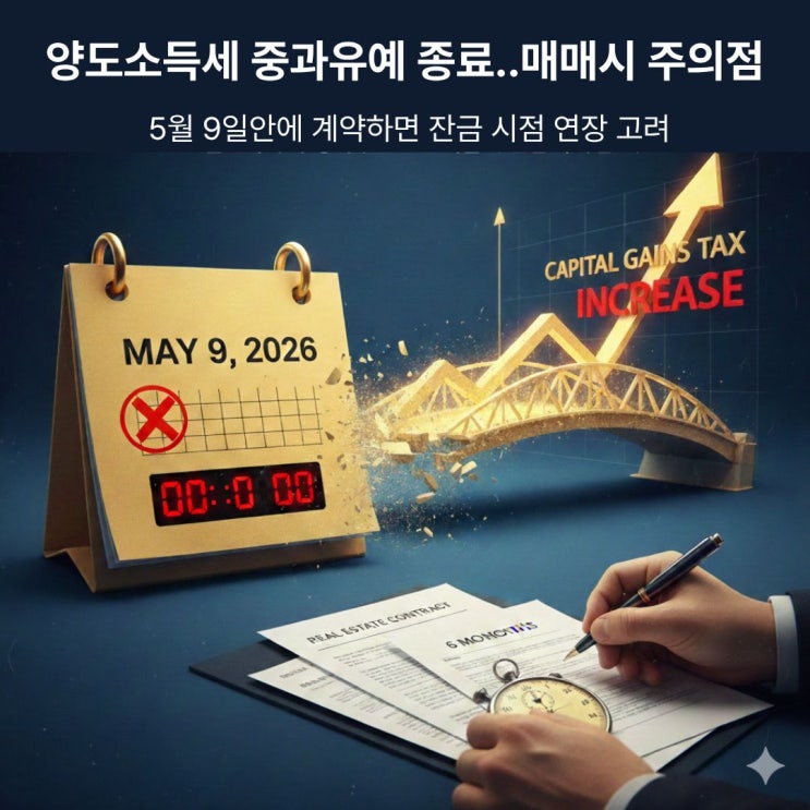 2026년 5월, 다주택자들에게 중요한 변화가 찾아와요. 그동안 유예됐던 양도세 중과가 본격적으로 시행되면서 부동산 시장에 큰 파장이 예상되거든요. 지금 집을 팔지, 아니면 좀 더 기다릴지 고민하고 계신가요? 이 글에서 양도세 중과 유예 종료에 따른 세금 부담 변화와 현명한 대응 전략을 같이 한번 생각해 봐요. 양도세 중과, 무엇이 달라지나? 양도소득세 중과는 집을 여러 채 가진 분들이 조정대상지역 내 주택을 팔 때 기본세율에 추가로 세금을 더 내는 제도예요. 그동안은 유예 조치로 잠시 쉬어갔지만, 이제 다시 본격적으로 적용되는 거죠. 2주택자는 기본세율에 20%포인트, 3주택 이상 보유자는 30%포인트가 더해져요. 쉽게 말해서....... <img src="https://blogthumb.pstatic.net/MjAyNjAyMDRfMjY4/MDAxNzcwMTg3MzcyMzYz.8EVMKYZrUCdxMwj6Yn89OJWQ9GjzXZwZLPg93GfGKs0g.VC55ha3BM97le5fMJoc96lL5U0p7yOCx9Xk2gqD3dXUg.JPEG/%C5%E4%C7%E3%C1%A6_%281%29.jpg?type=s3" />