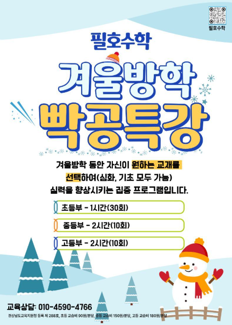안녕하세요 산호동 필호수학입니다^^ 이번 겨울방학 특강 프로그램을 고민 끝에 개설했습니다 아래에서 자세히 안내드릴게요! 보통 방학 특강이라하면 기존에 짜인 틀에 맞게 형식적으로 진행하는 것이 대부분이죠 ㅜㅜ 저는 특강만의 본질에 충실하고 싶어서 많은 고민을 했습니다 방학은 학습능력을 업그레이드 시킬 수 있는 정말 중요한 시기인데 그걸 놓치지 않고 아이들의 실력을 급격히 상승시켜주고 싶었어요 그래서 이번 특강은 이렇게 진행합니다! 사진 그대로 자신이 원하는 교재를 직접 선택하여 집중적으로 공부할 수 있는 프로그램입니다! 평소 심화 교재를 사용하고 싶었으면 심화 교재를, 기초를 다지고 싶었으면 기초 교재를 선....... <img src="https://blogthumb.pstatic.net/MjAyNTEyMTFfMTU2/MDAxNzY1NDE4NjAyNDM0.KOFU2yr_iJkE-0UVqskhCXsYCmXIuX3zOE346-Cw5MEg.2x8XLq8BOWG3VKfiuO8MW-pCKgXADqjZb_5mkm-QCkEg.PNG/image.png?type=s3" />